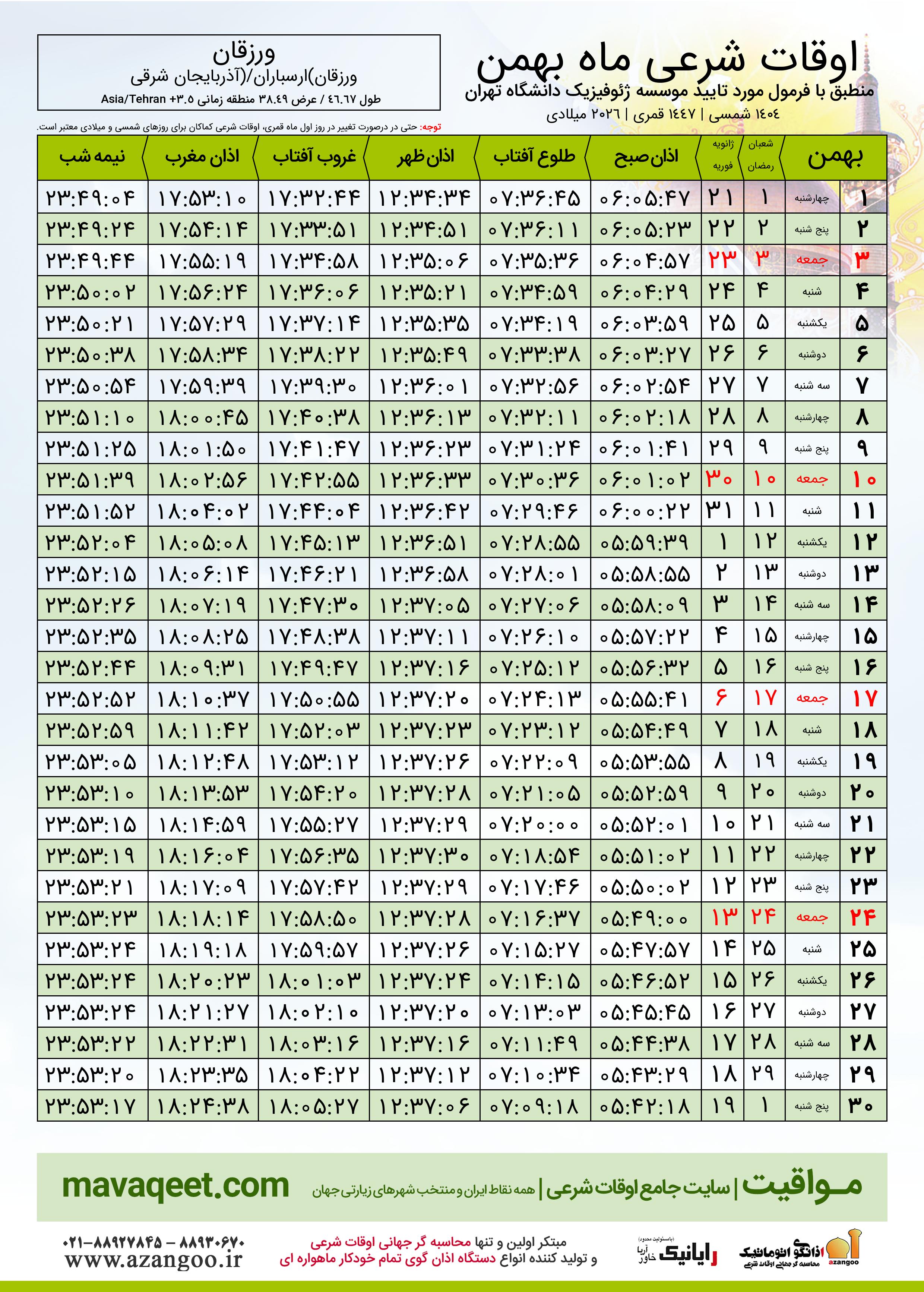 اوقات شرعی فوریه ٢٠٢٦ شهر ورزقان + دانلود