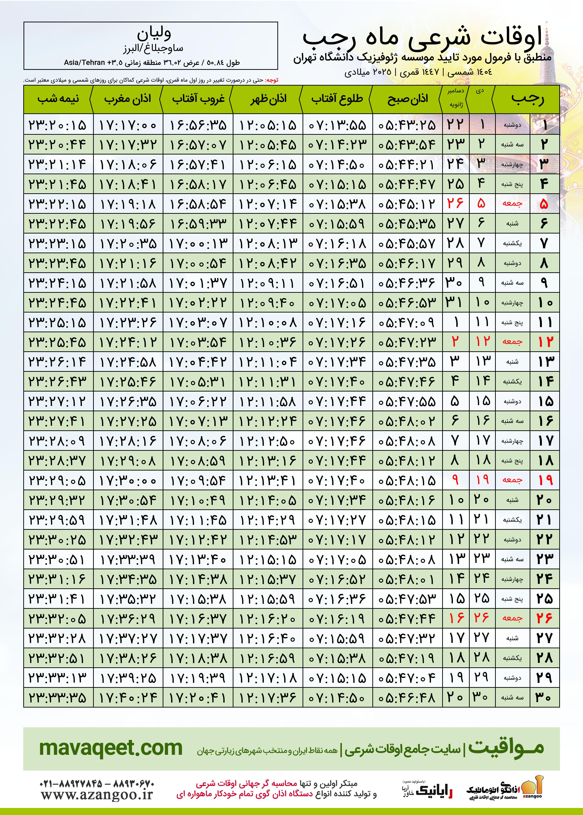 اوقات شرعی ماه رجب ١٤٤٧ هـ.ق شهر ولیان بر