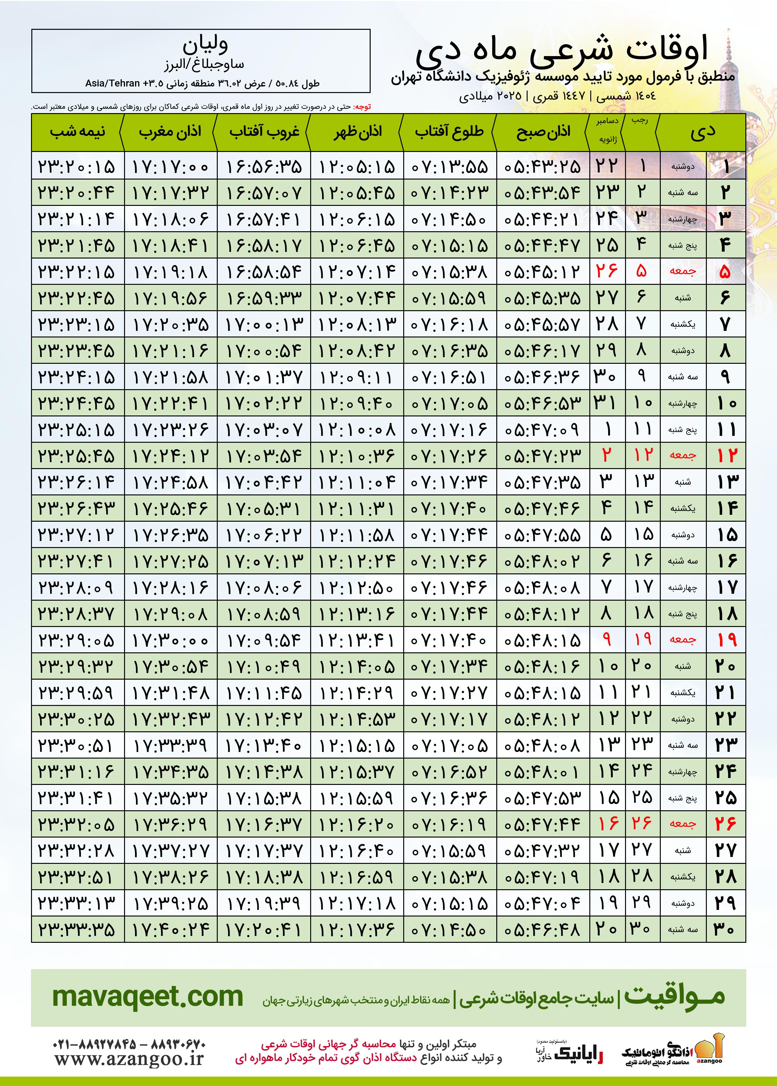 دانلود اوقات شرعی دی ٠٤ - ١٤٠٤ شهر ولیان
