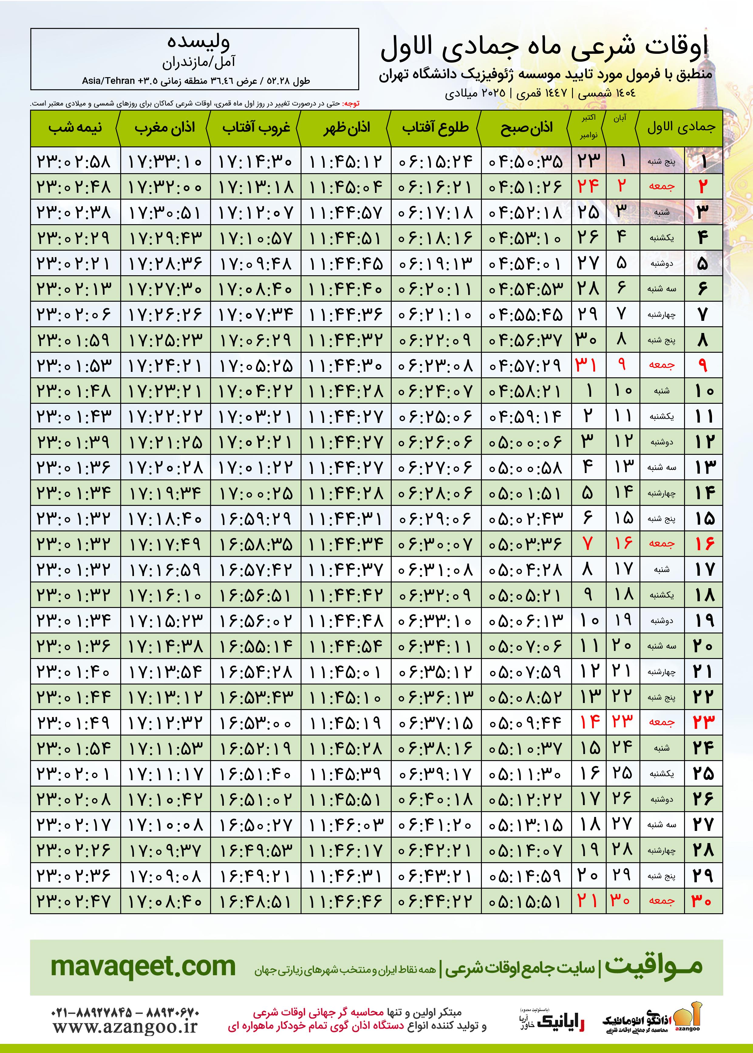 جدول اوقات شرعی جمادی الاول ١٤٤٧ قمری شهر ولیسده