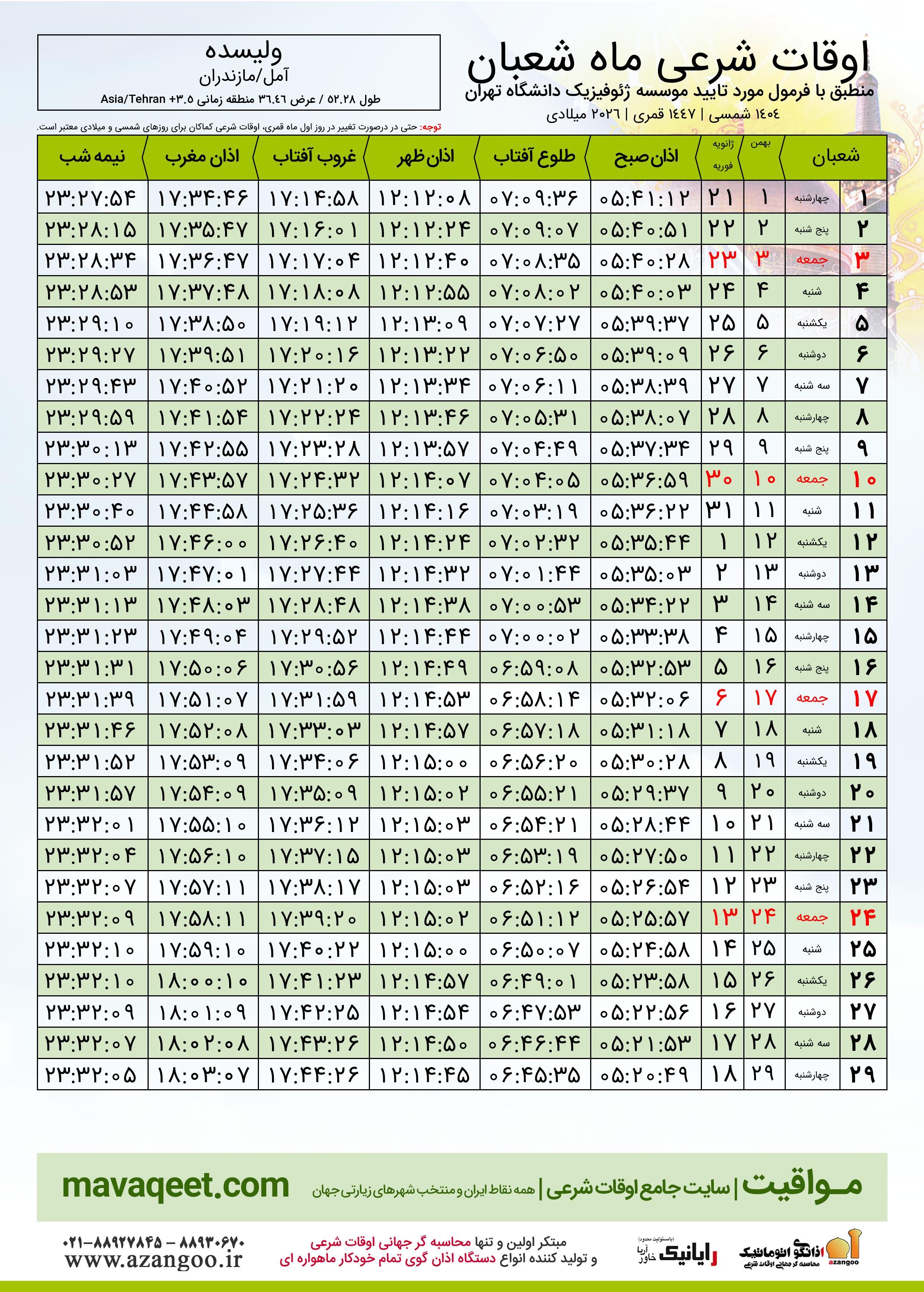 دانلود اوقات شرعی ماه شعبان ١٤٤٧ هـ.ق