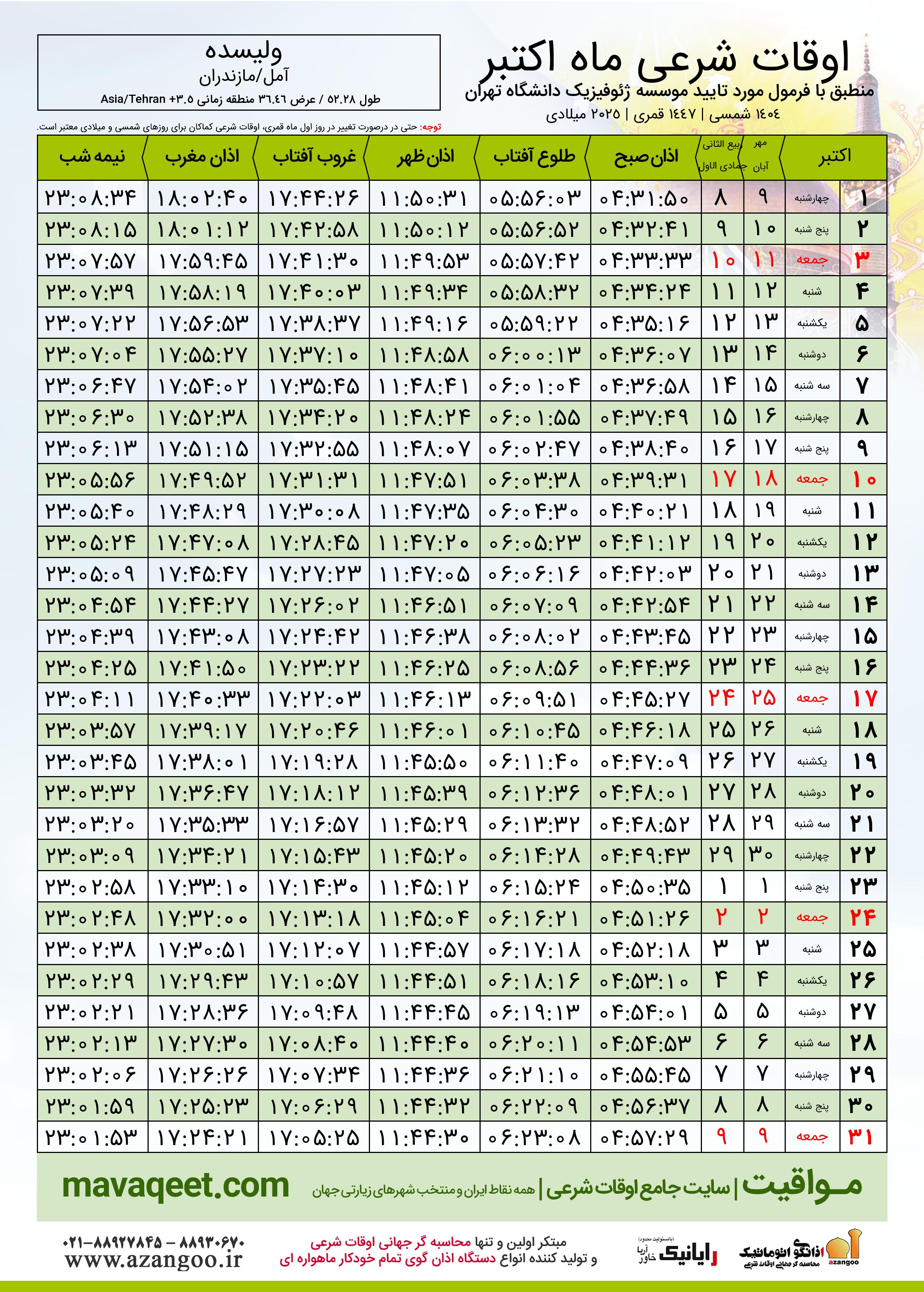 دانلود اوقات شرعی اکتبر ٢٠٢٥ شهر ولیسده