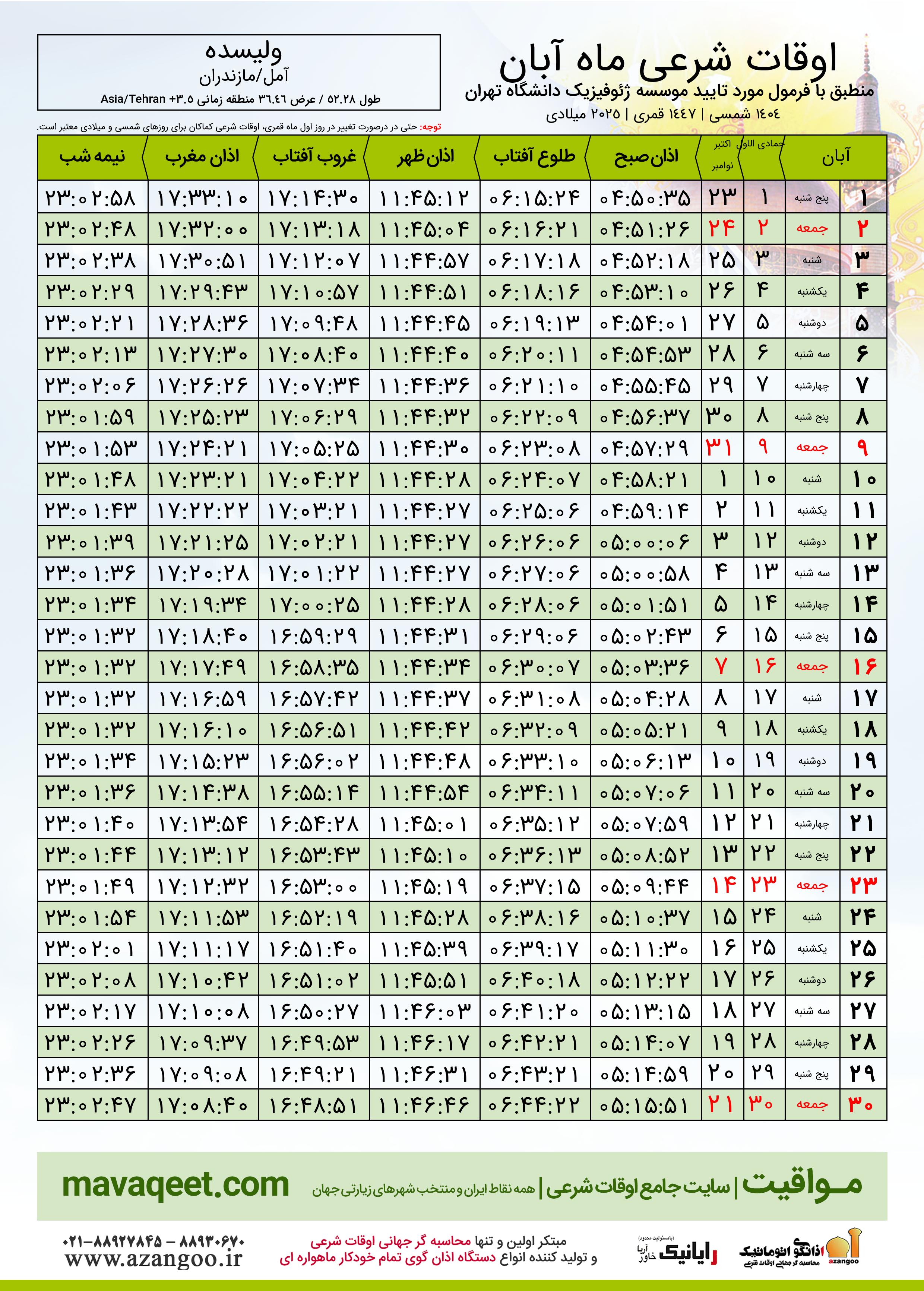 جدول اوقات شرعی آبان ١٤٠٤ شمسی شهر ولیسده