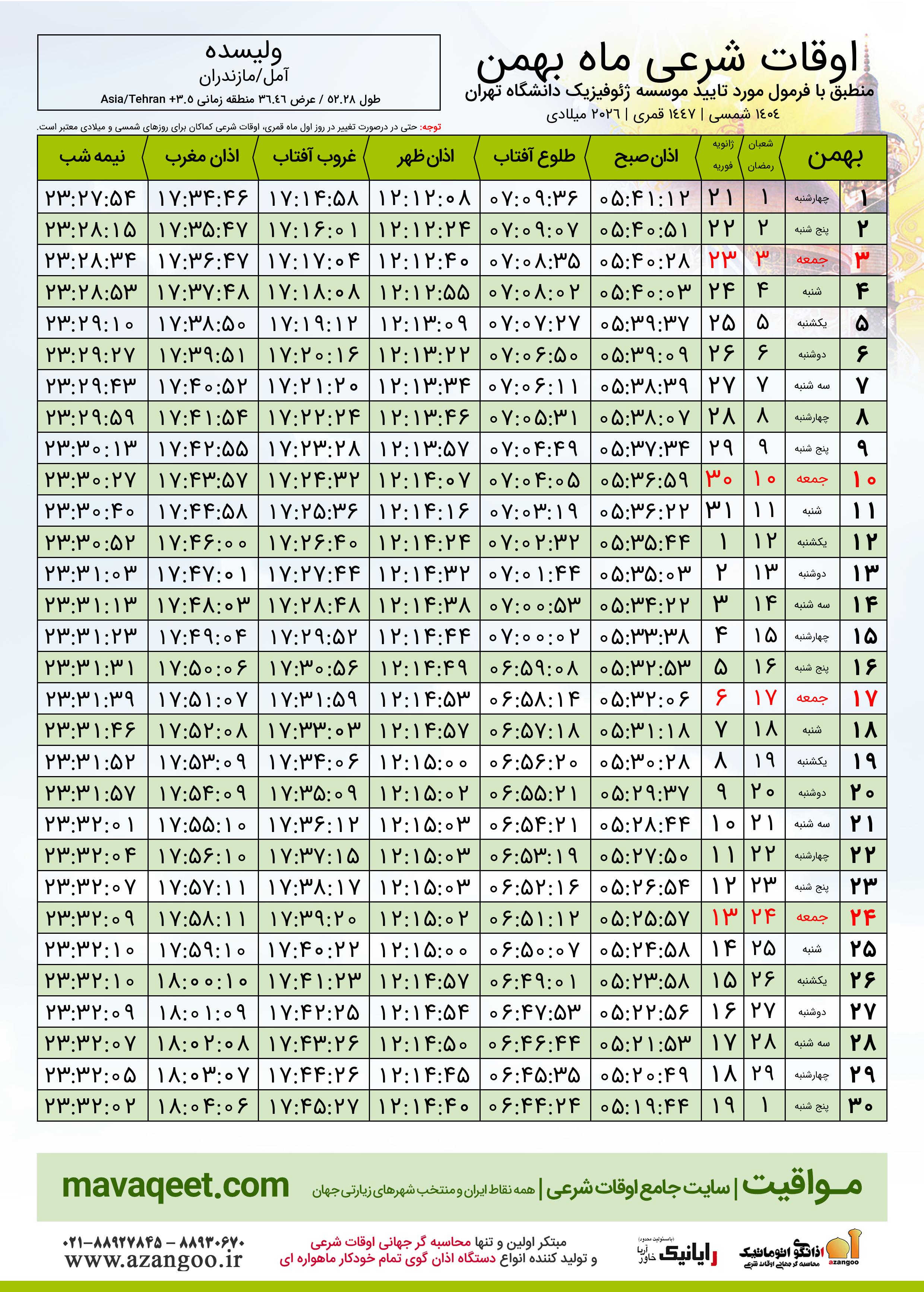| ٢١ بهمن ١٤٠٤ | ٠٥:٢٨:٤٤ | ٠٦:٥٤:٢١ | ١٢:١٥:٠٣ | ١٧:٣٦:١٢ | ١٧:٥٥:١٠ | ٢٣:٣٢:٠١ |