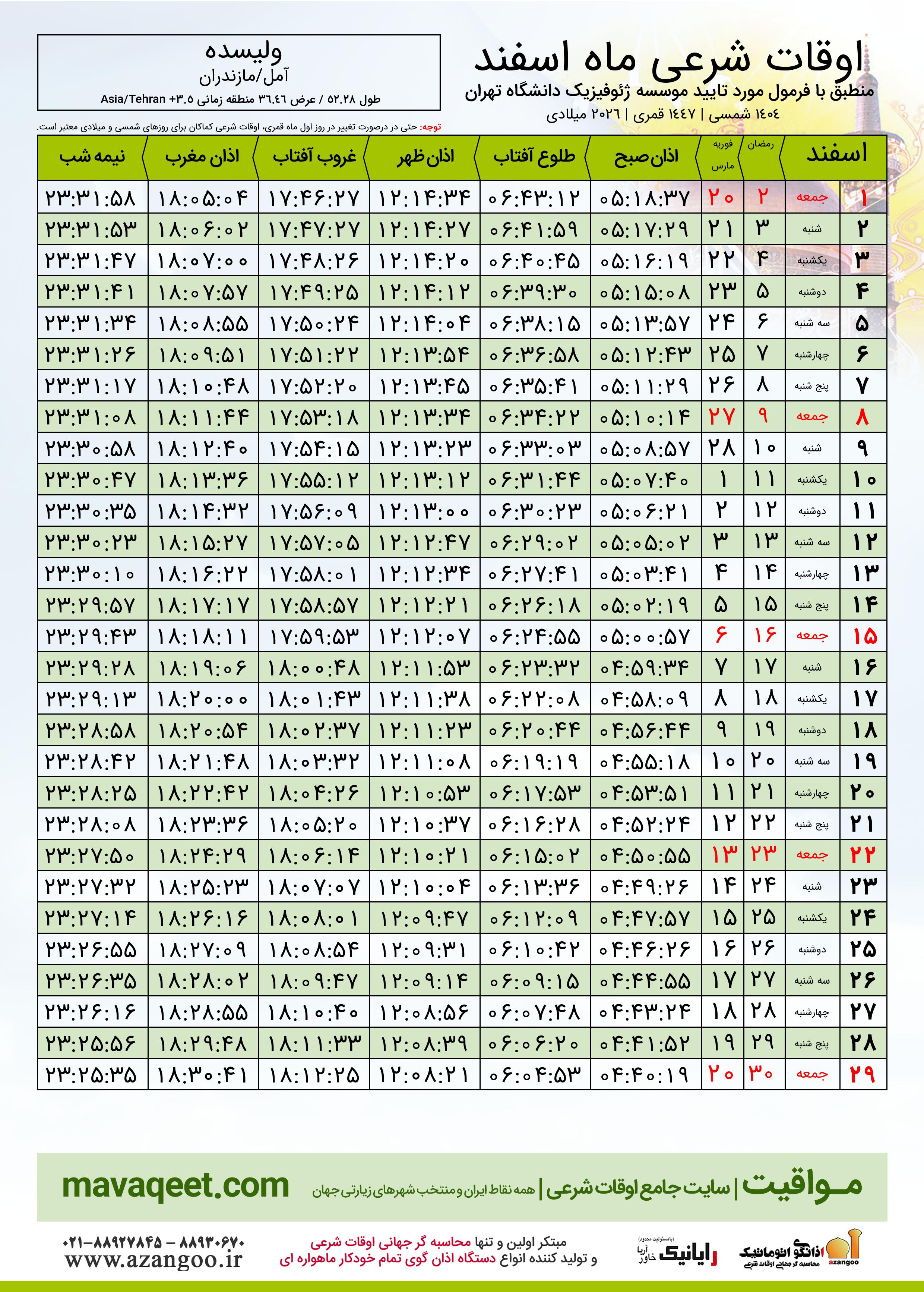 جدول اوقات شرعی ماه رمضان شهر ولیسده ٠٤ - ١٤٠٤ شمسی | ٢٠٢٦ میلادی | ١٤٤٧ قمری