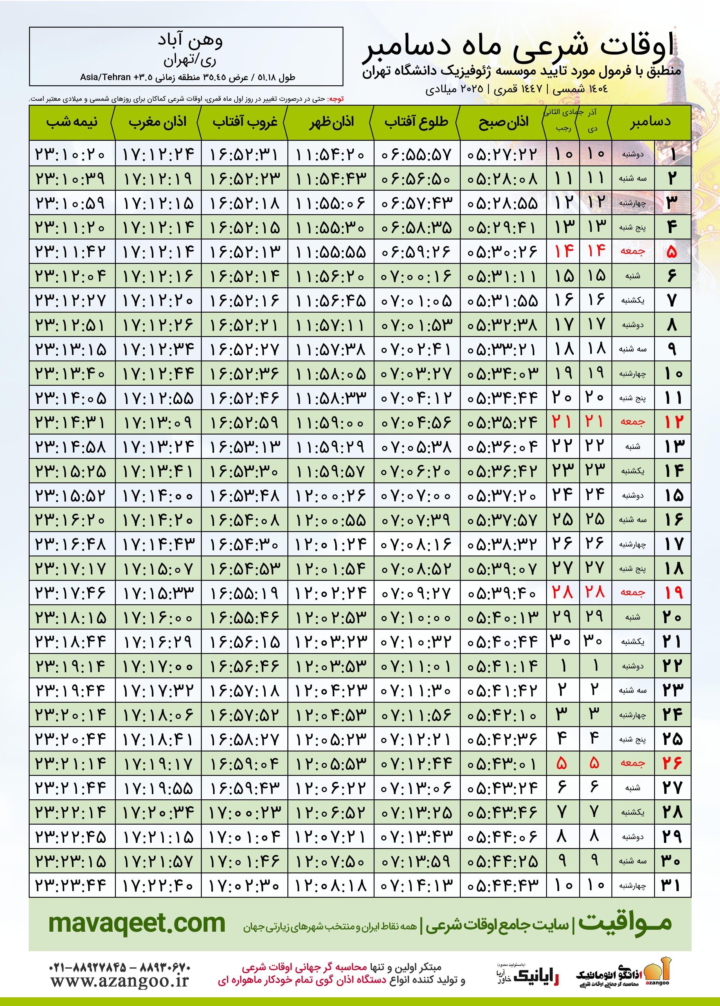 جدول اوقات شرعی نوامبر ٢٠٢٥ میلادی شهر وهن آباد