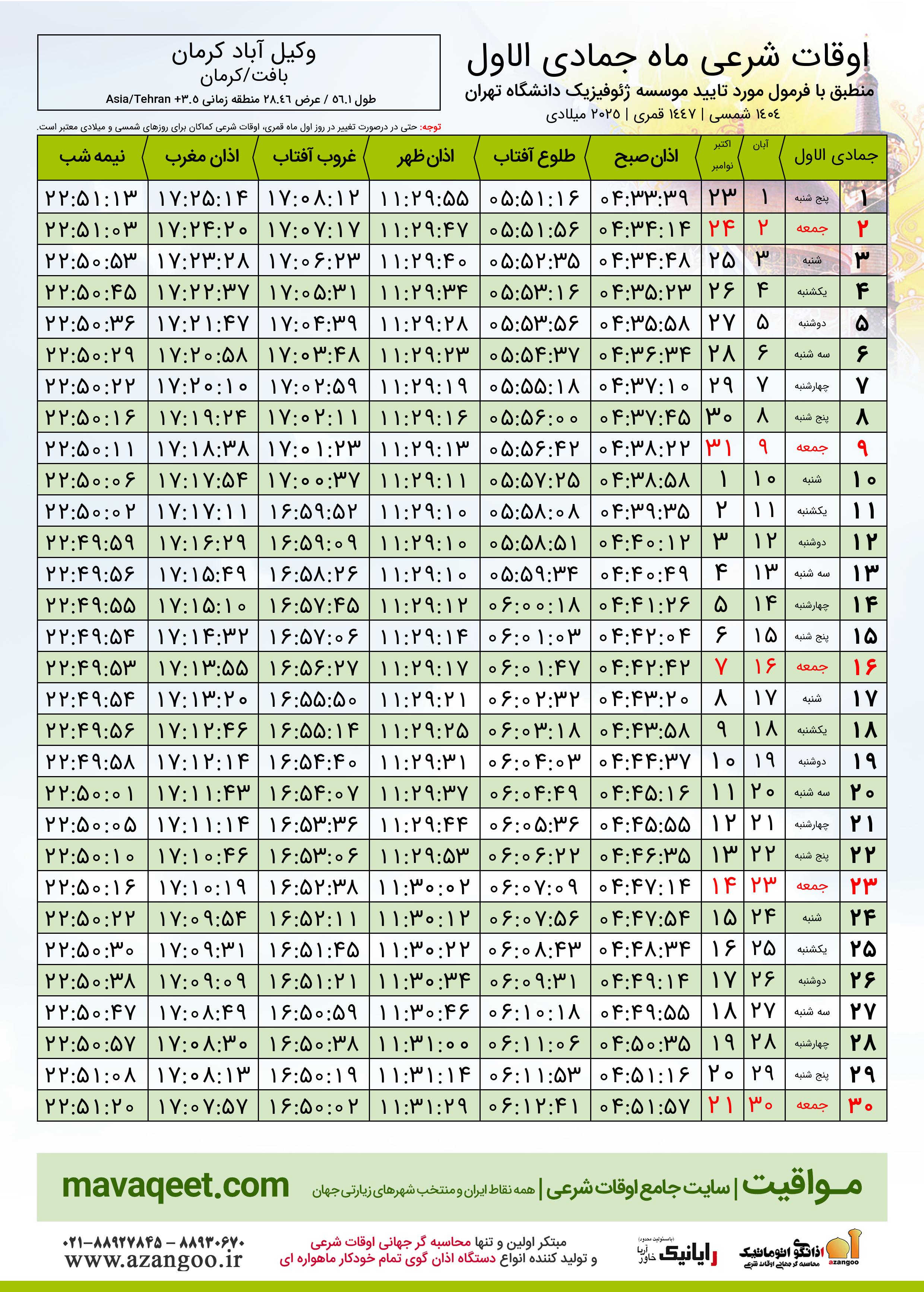جدول اوقات شرعی جمادی الاول ١٤٤٧ قمری شهر وکیل آباد کرمان