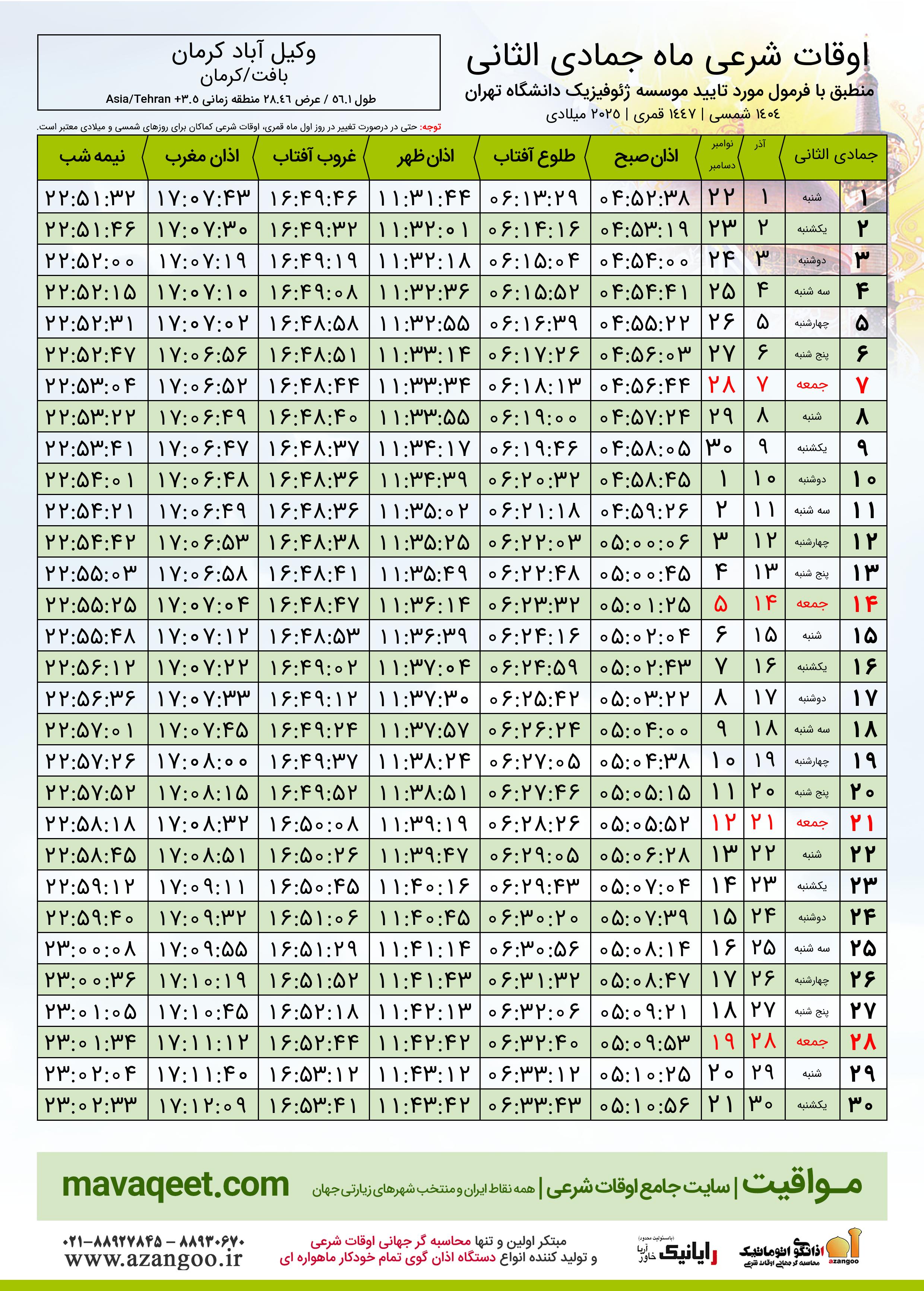 اوقات شرعی ماه جمادی الثانی ١٤٤٧ هـ.ق شهر وکیل آباد کرمان بر