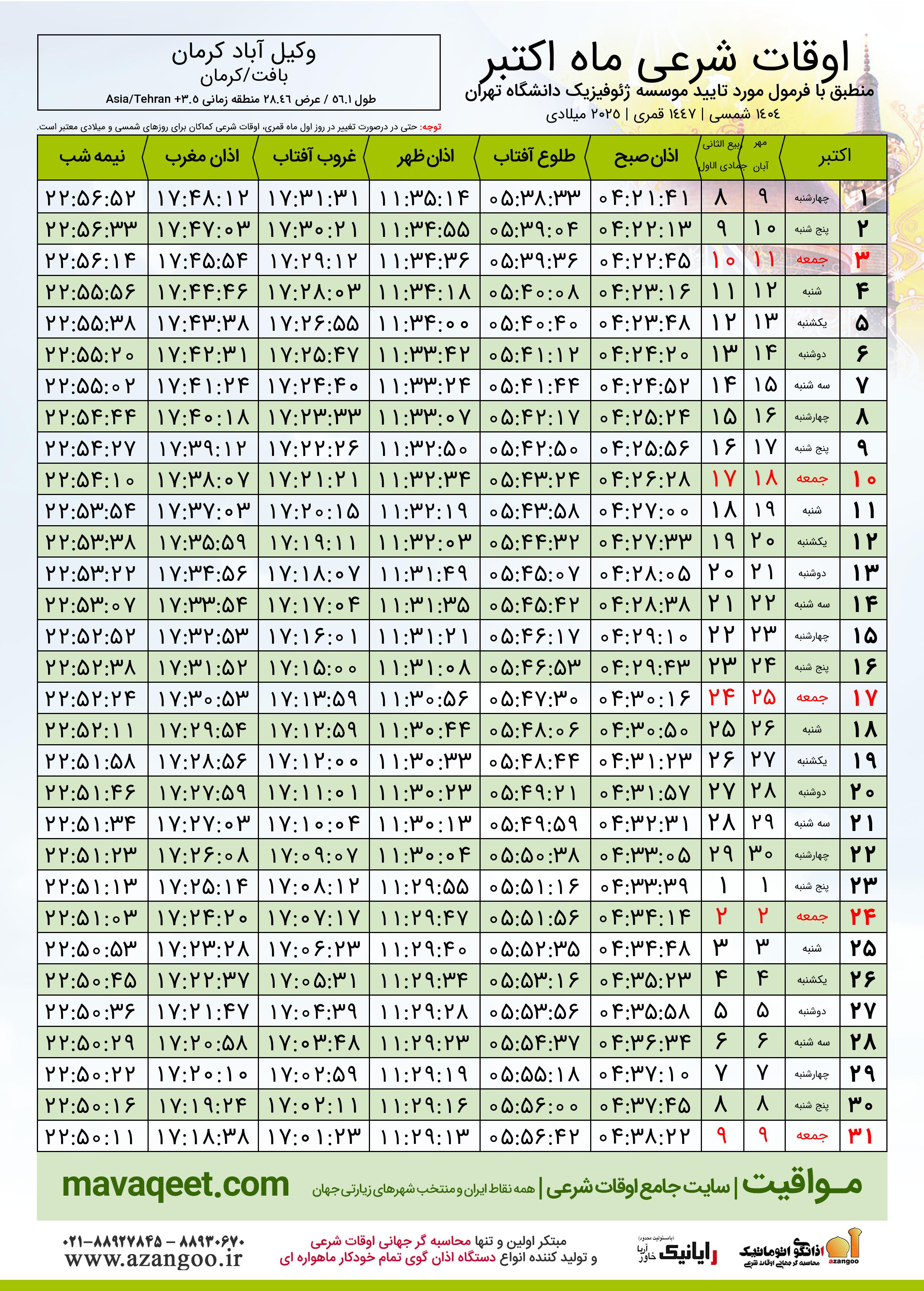 اوقات شرعی اکتبر ٢٠٢٥ میلادی شهر وکیل آباد کرمان
