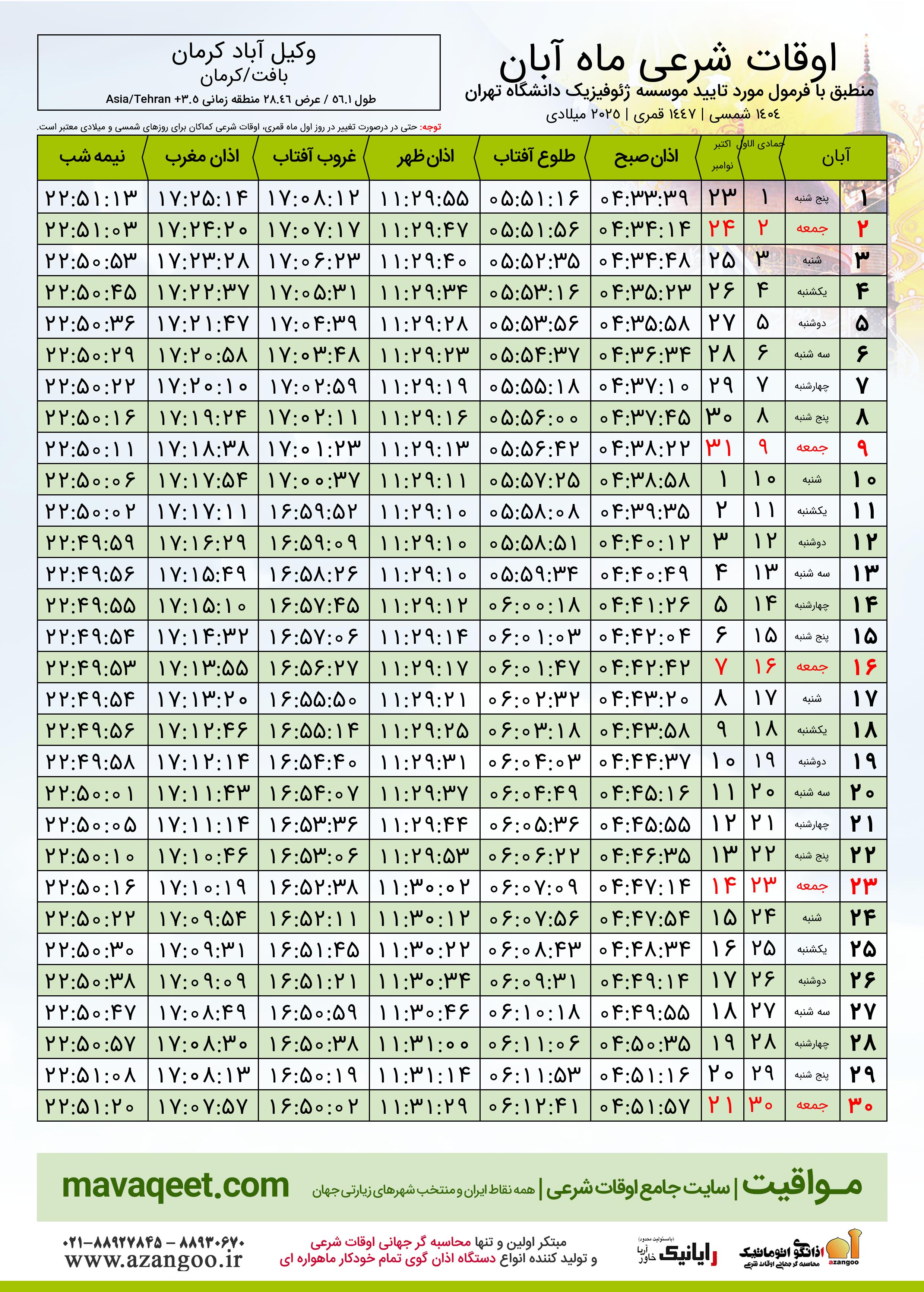 اوقات شرعی آبان ١٤٠٤ شمسی شهر وکیل آباد کرمان