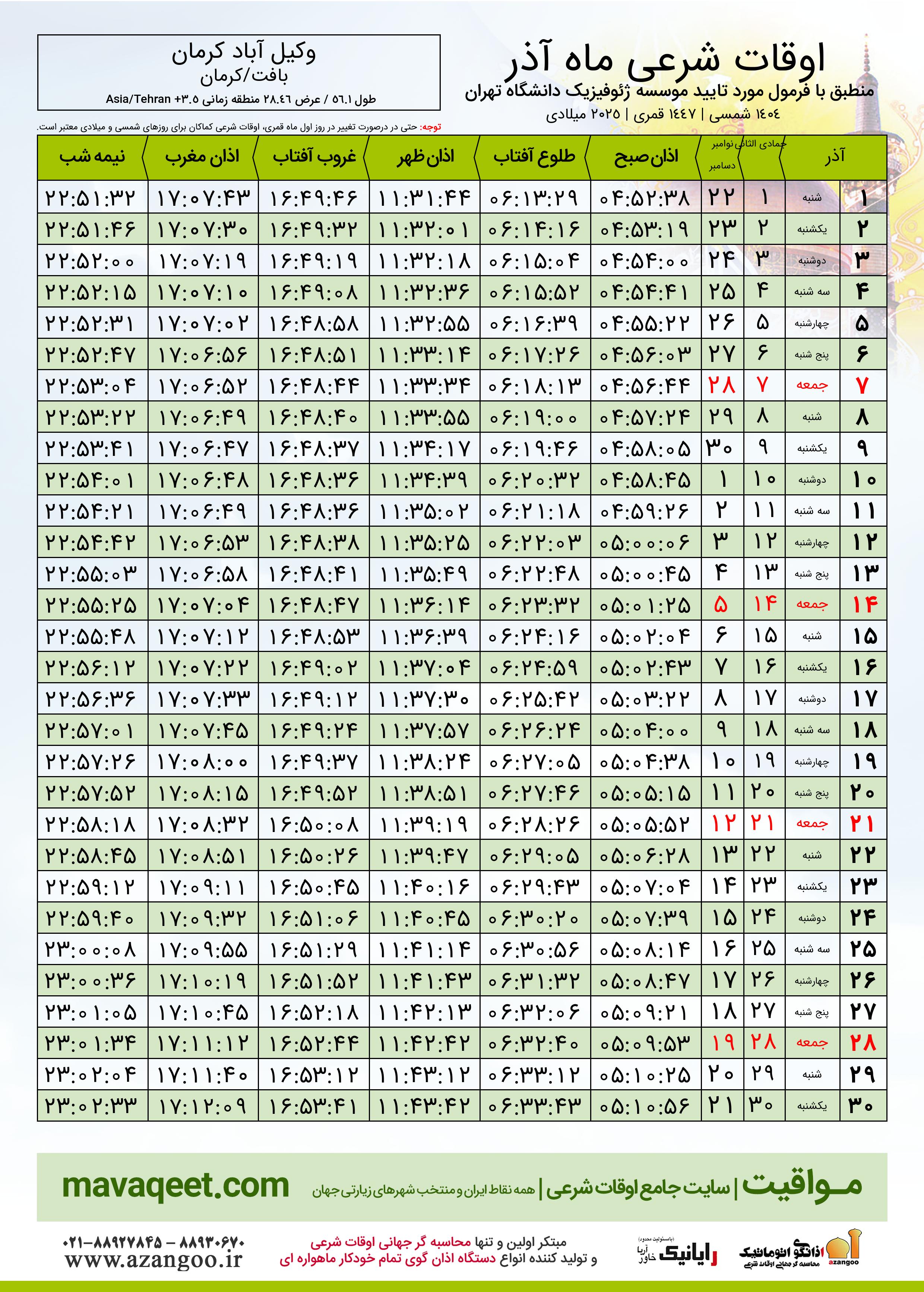 اوقات شرعی آذر ١٤٠٤ شمسی شهر وکیل آباد کرمان