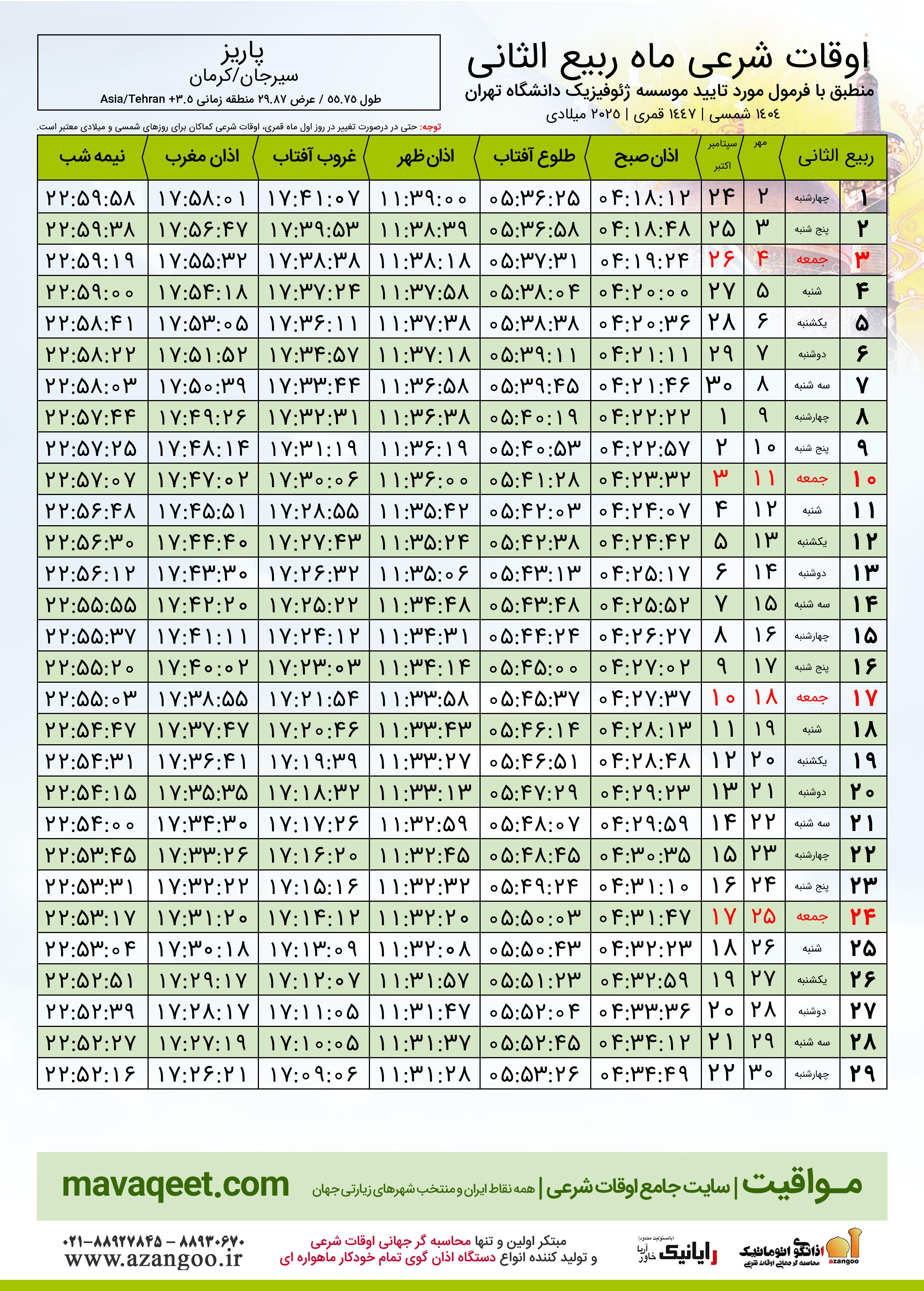 جدول اوقات شرعی ربیع الثانی ١٤٤٧ قمری شهر پاریز