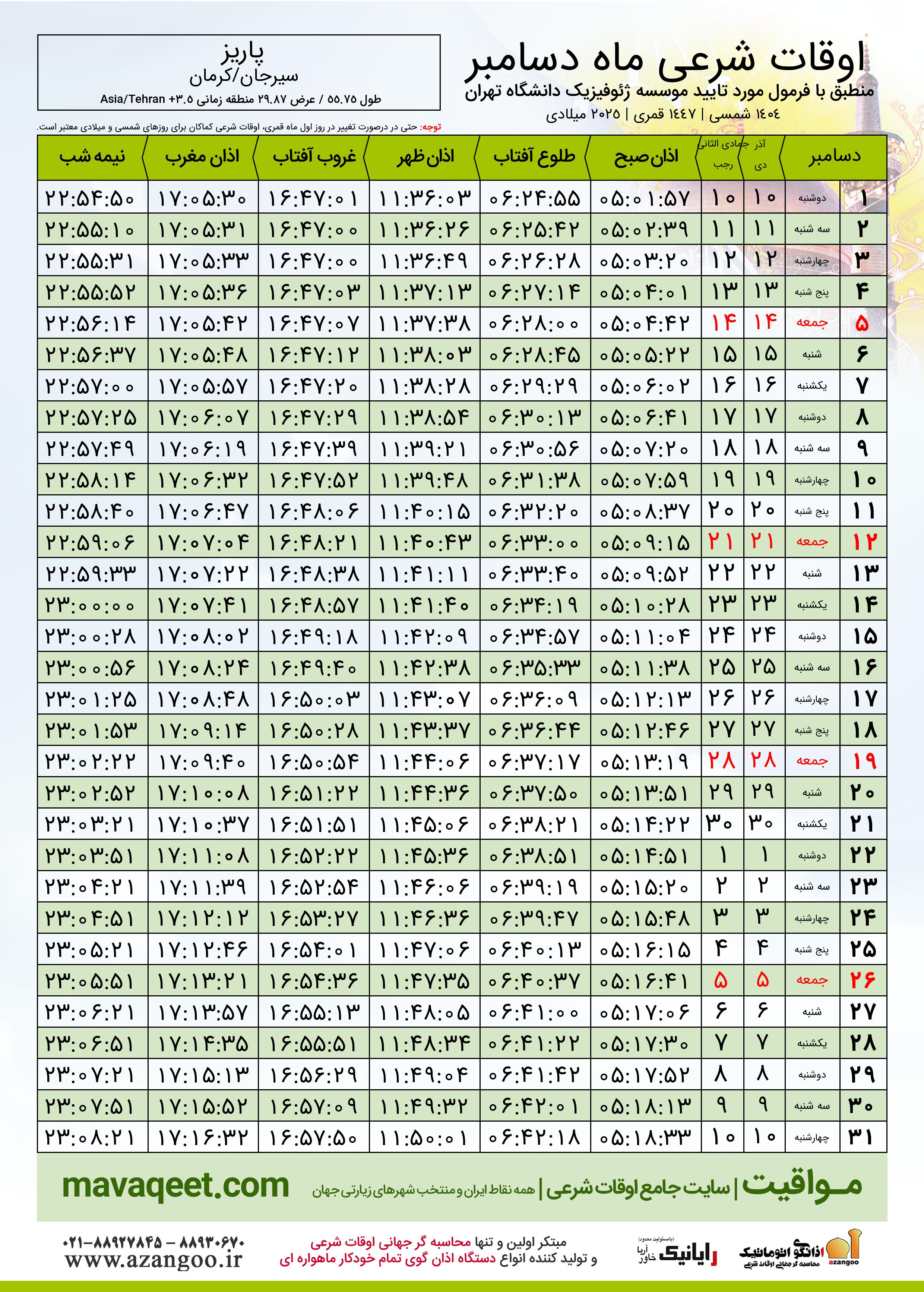 جدول اوقات شرعی دسامبر ٢٠٢٥ میلادی شهر پاریز