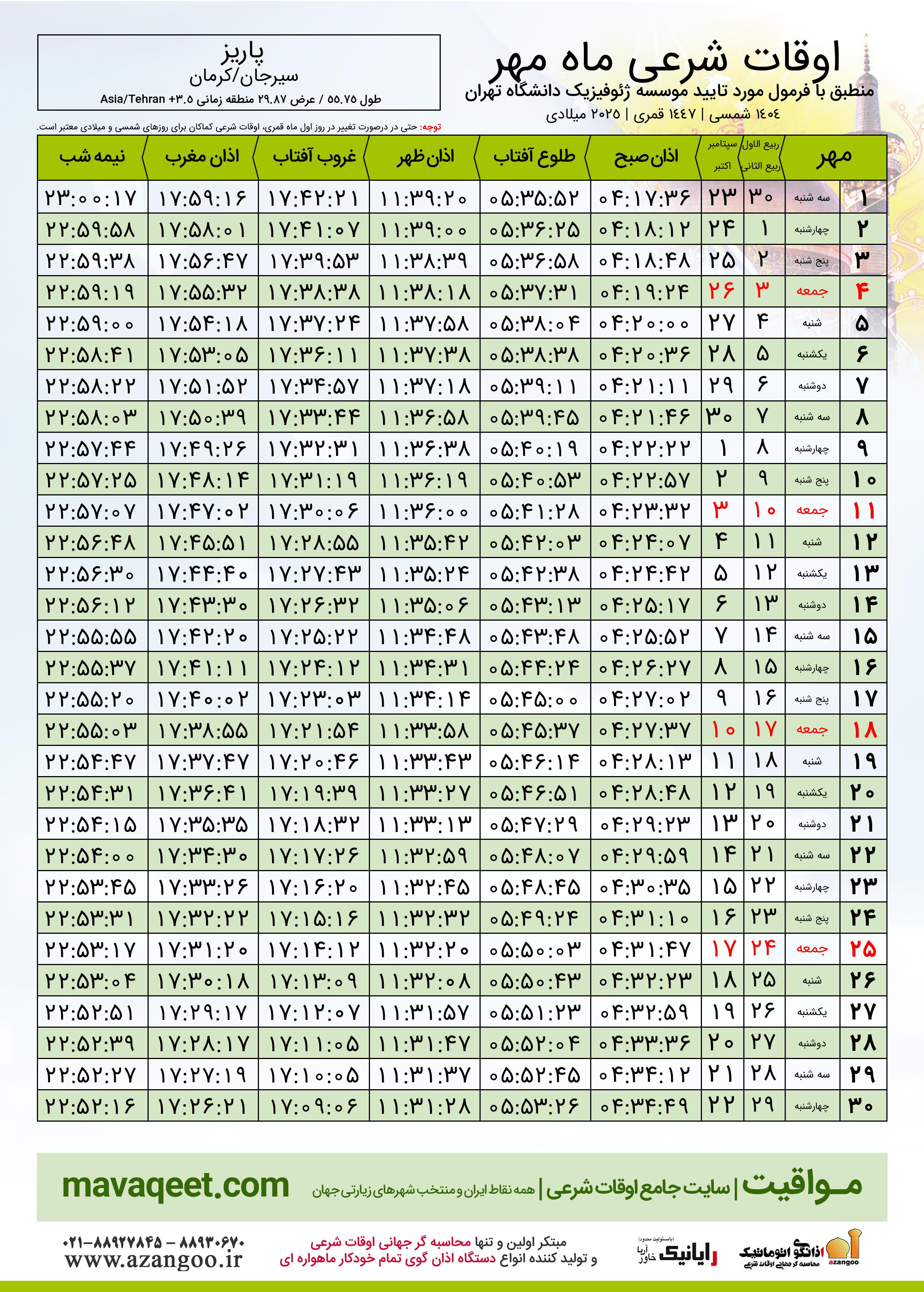 اوقات شرعی مهر ١٤٠٤ شمسی شهر پاریز