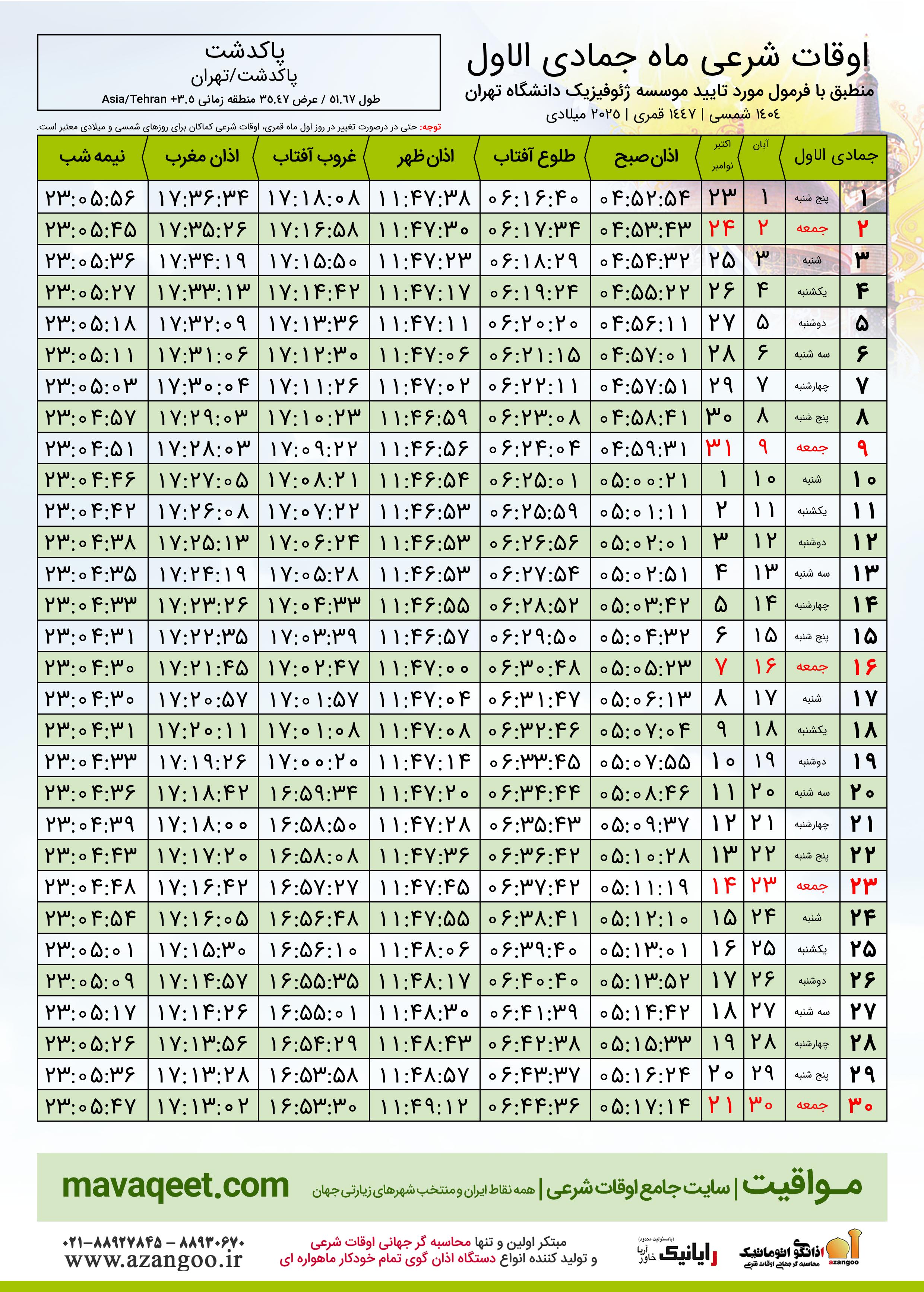اوقات شرعی ماه جمادی الاول ١٤٤٧ هـ.ق شهر پاکدشت بر