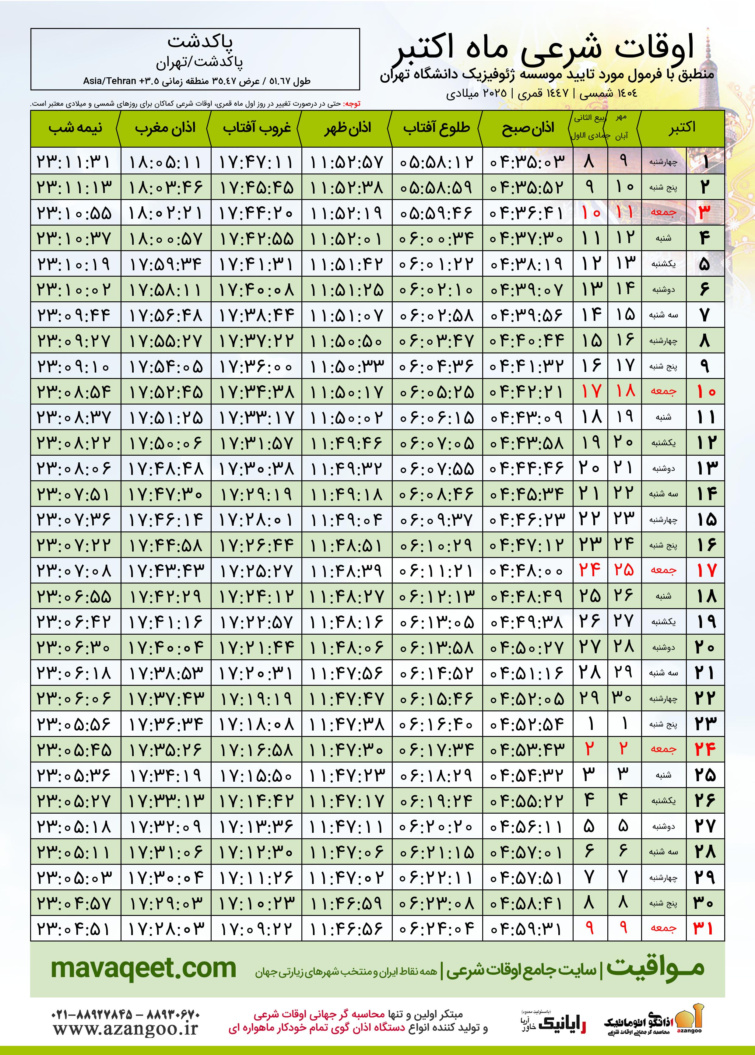اوقات شرعی اکتبر ٢٠٢٥ میلادی شهر پاکدشت