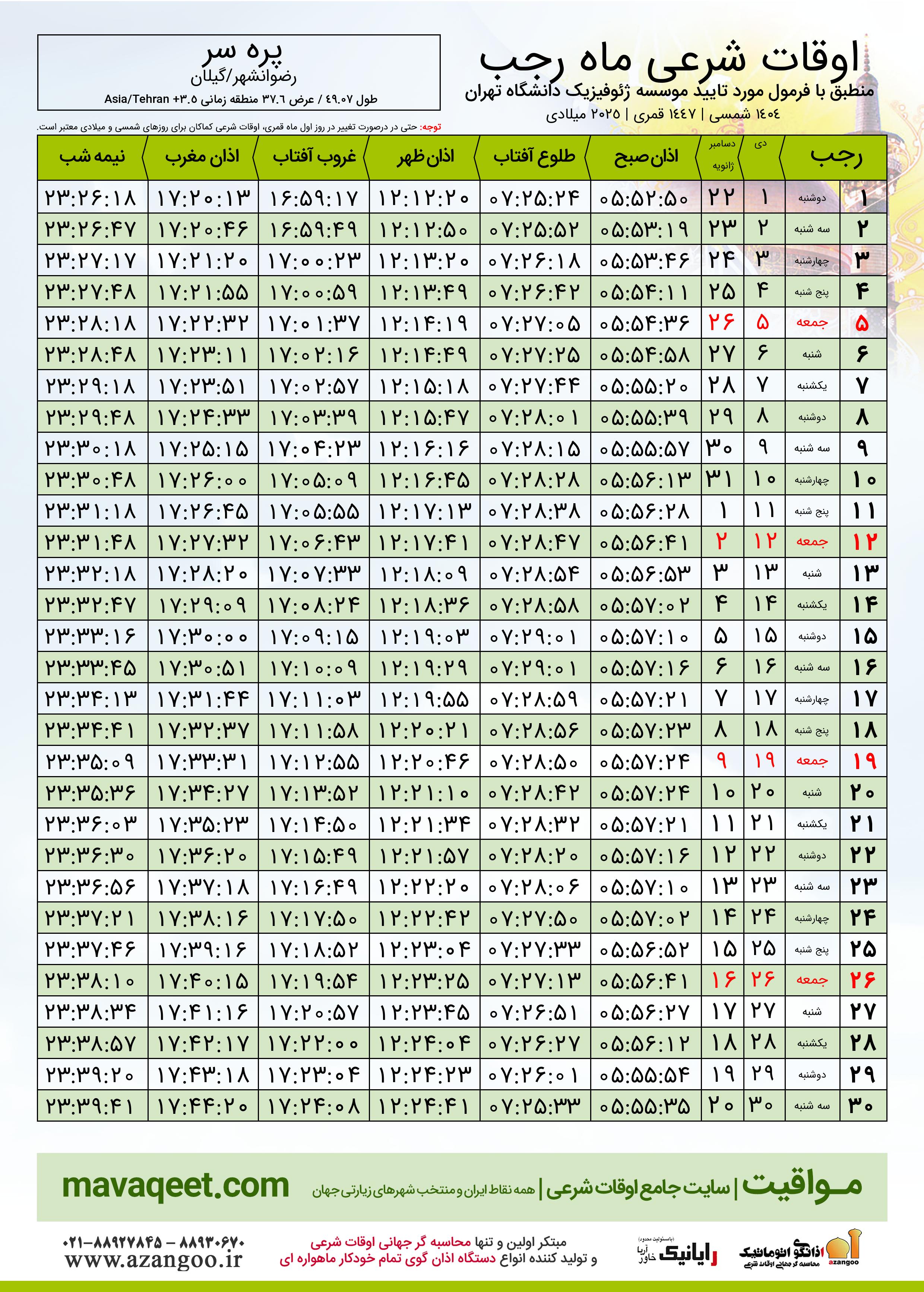 اوقات شرعی ماه رجب ١٤٤٧ هـ.ق شهر پره سر بر