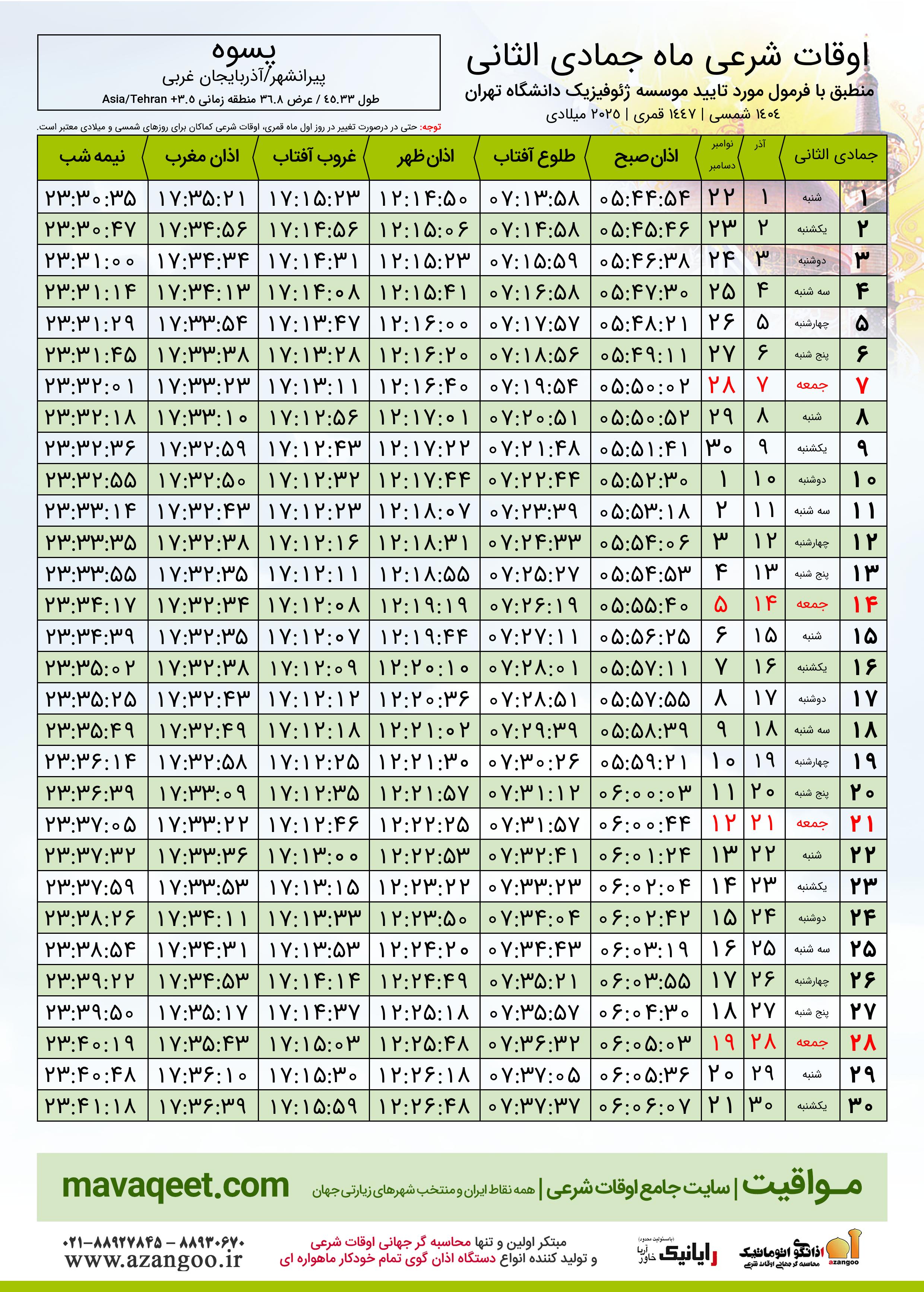جدول اوقات شرعی جمادی الثانی ١٤٤٧ قمری شهر پسوه