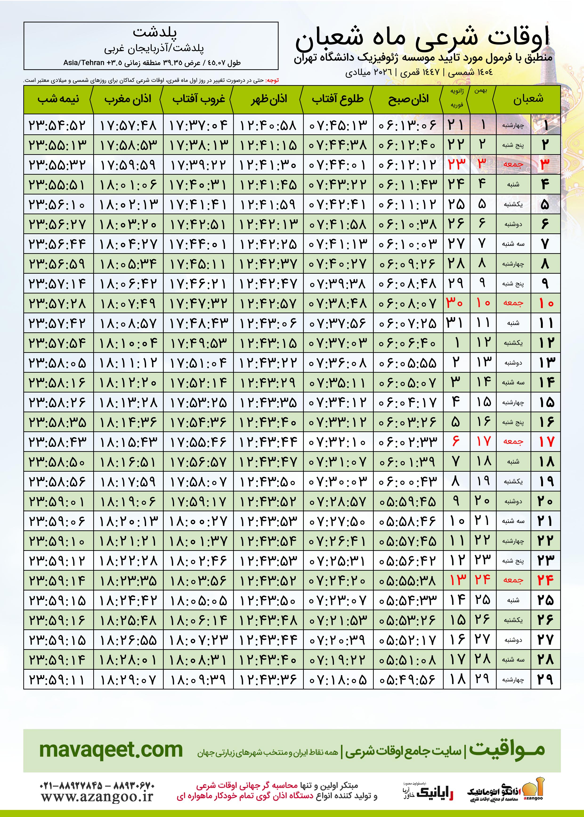 اوقات شرعی ماه شعبان ١٤٤٧ هـ.ق شهر پلدشت بر