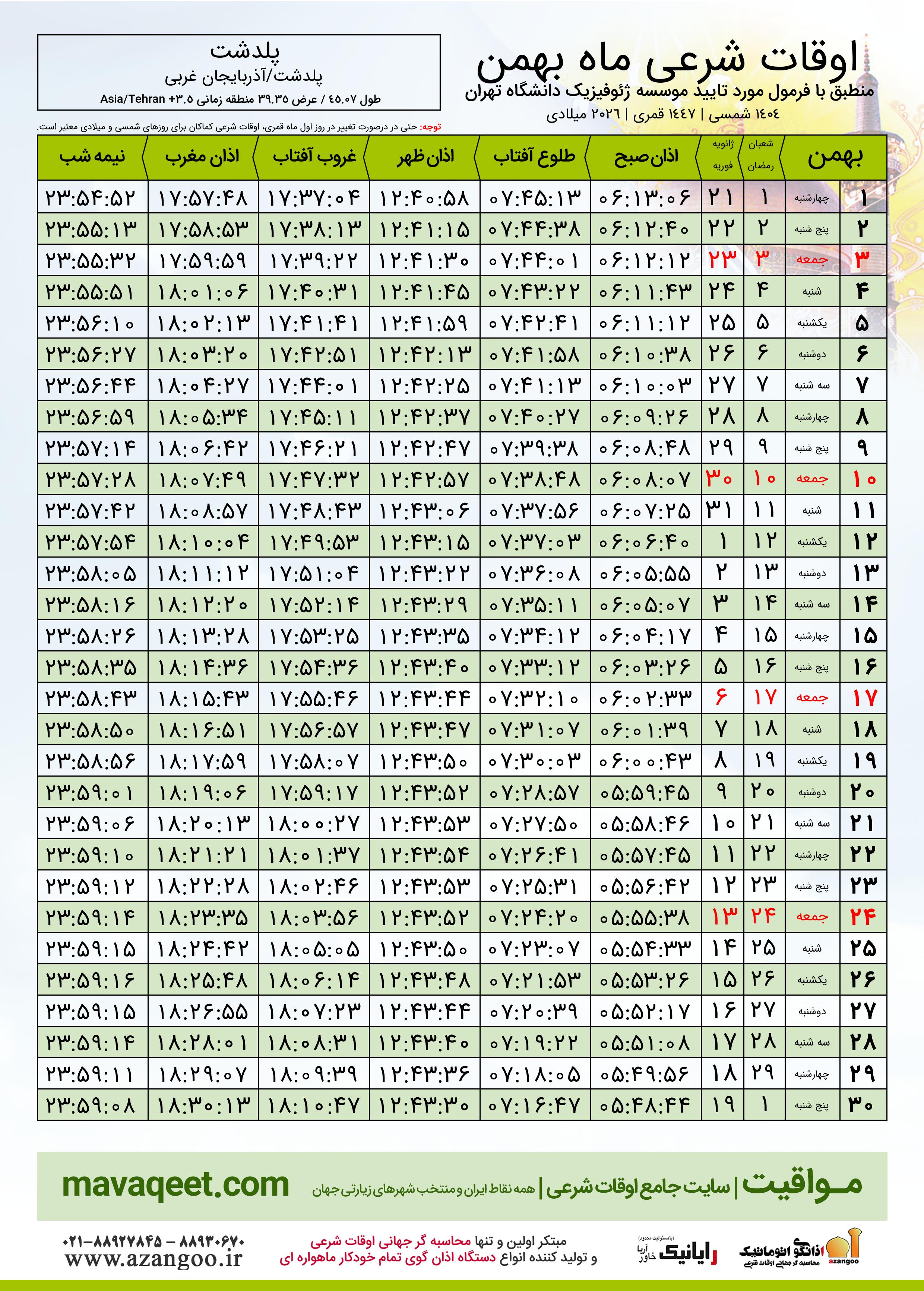 دانلود اوقات شرعی بهمن ٠٤ - ١٤٠٤ شهر پلدشت