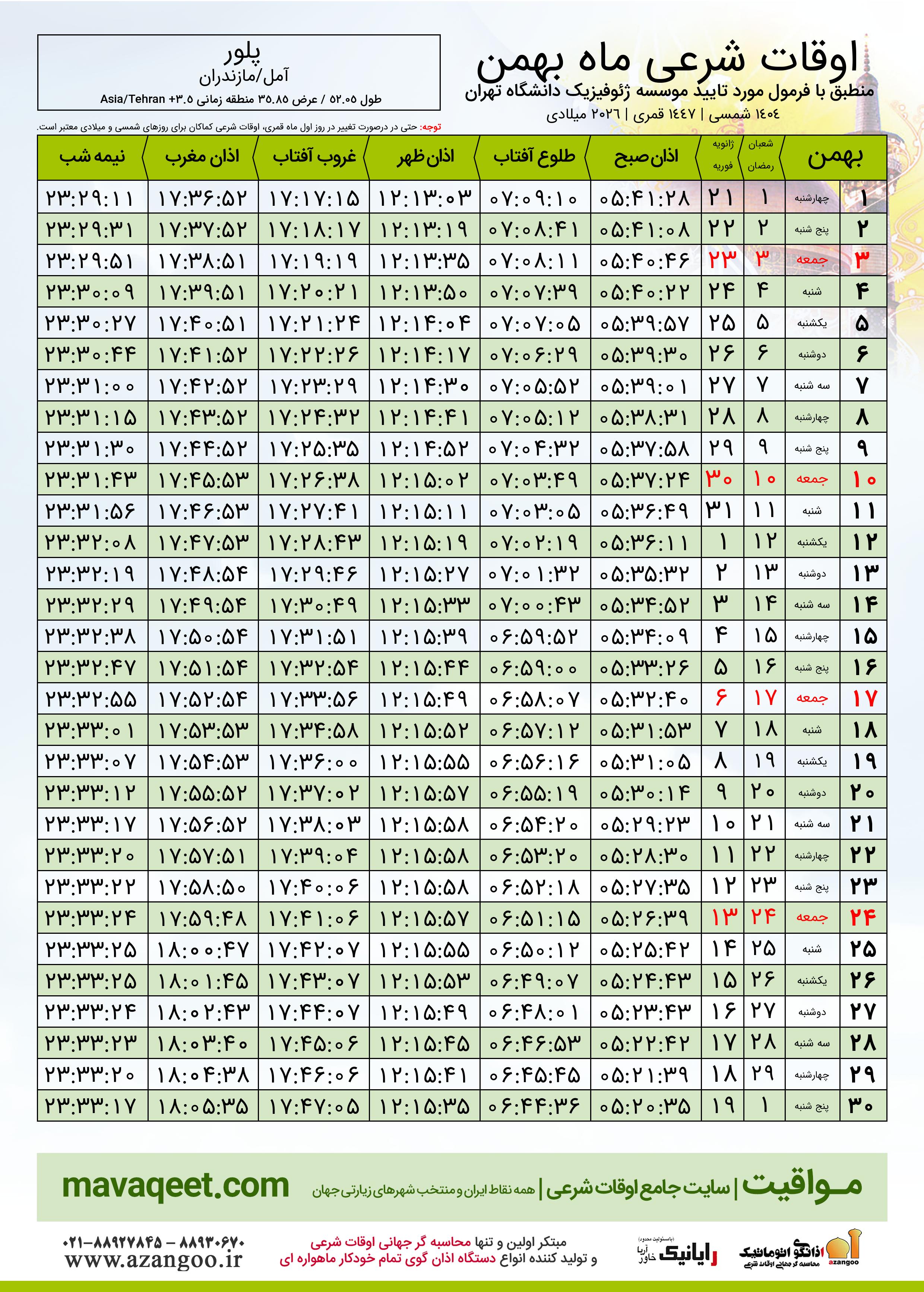 دانلود اوقات شرعی بهمن ٠٤ - ١٤٠٤ شهر پلور