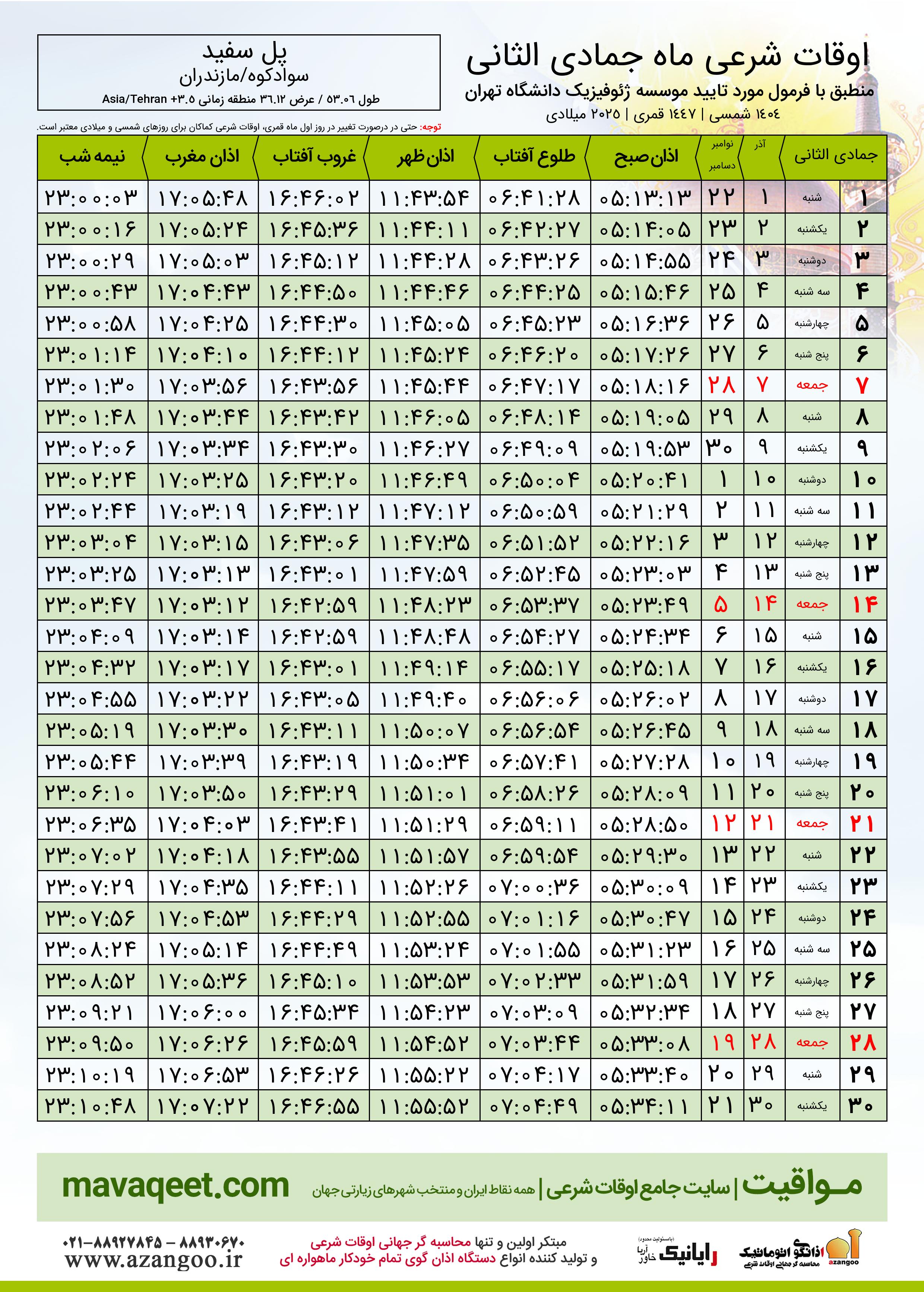 اوقات شرعی ماه جمادی الثانی ١٤٤٧ هـ.ق شهر پل سفید بر