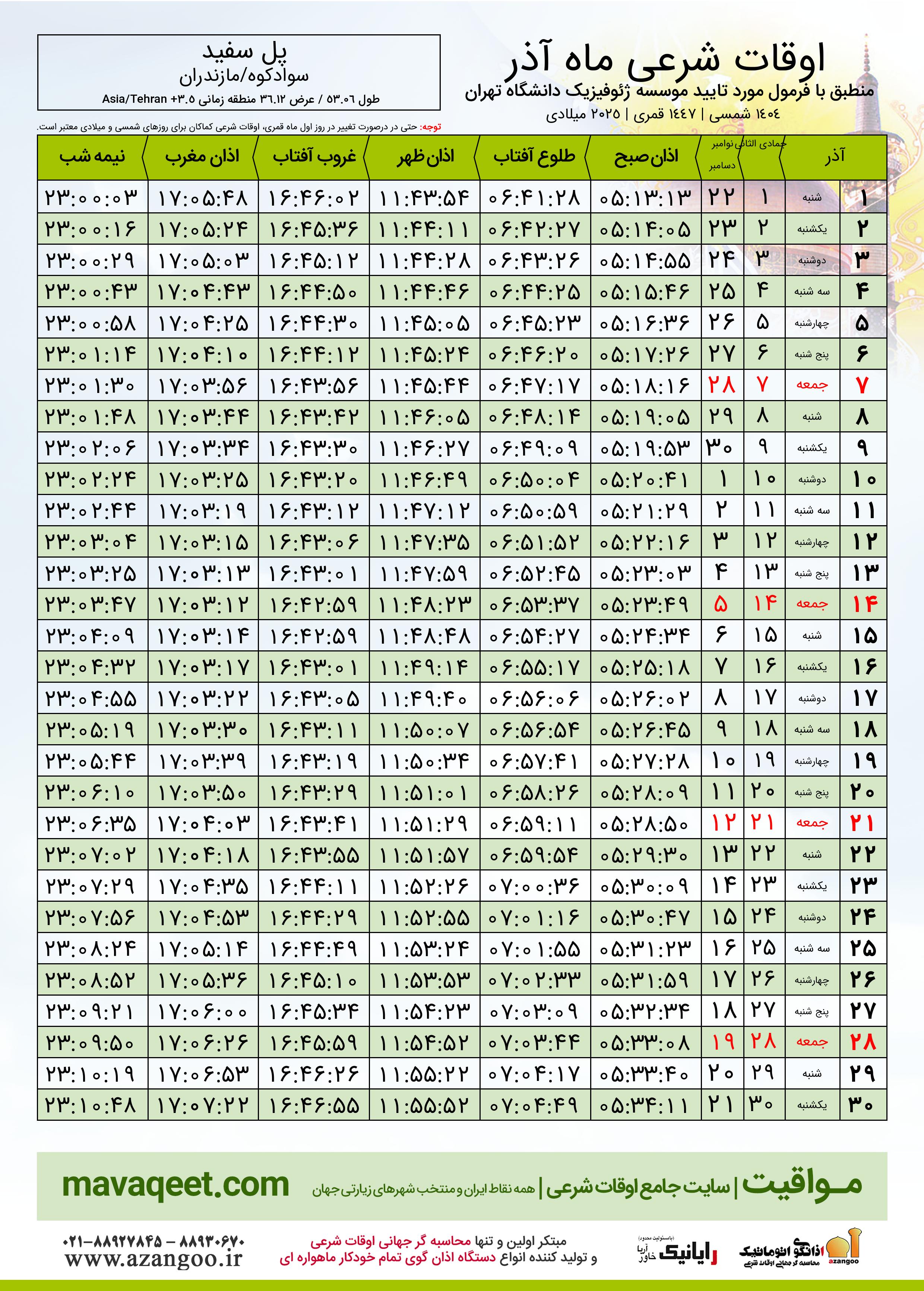 جدول اوقات شرعی آذر ١٤٠٤ شمسی شهر پل سفید