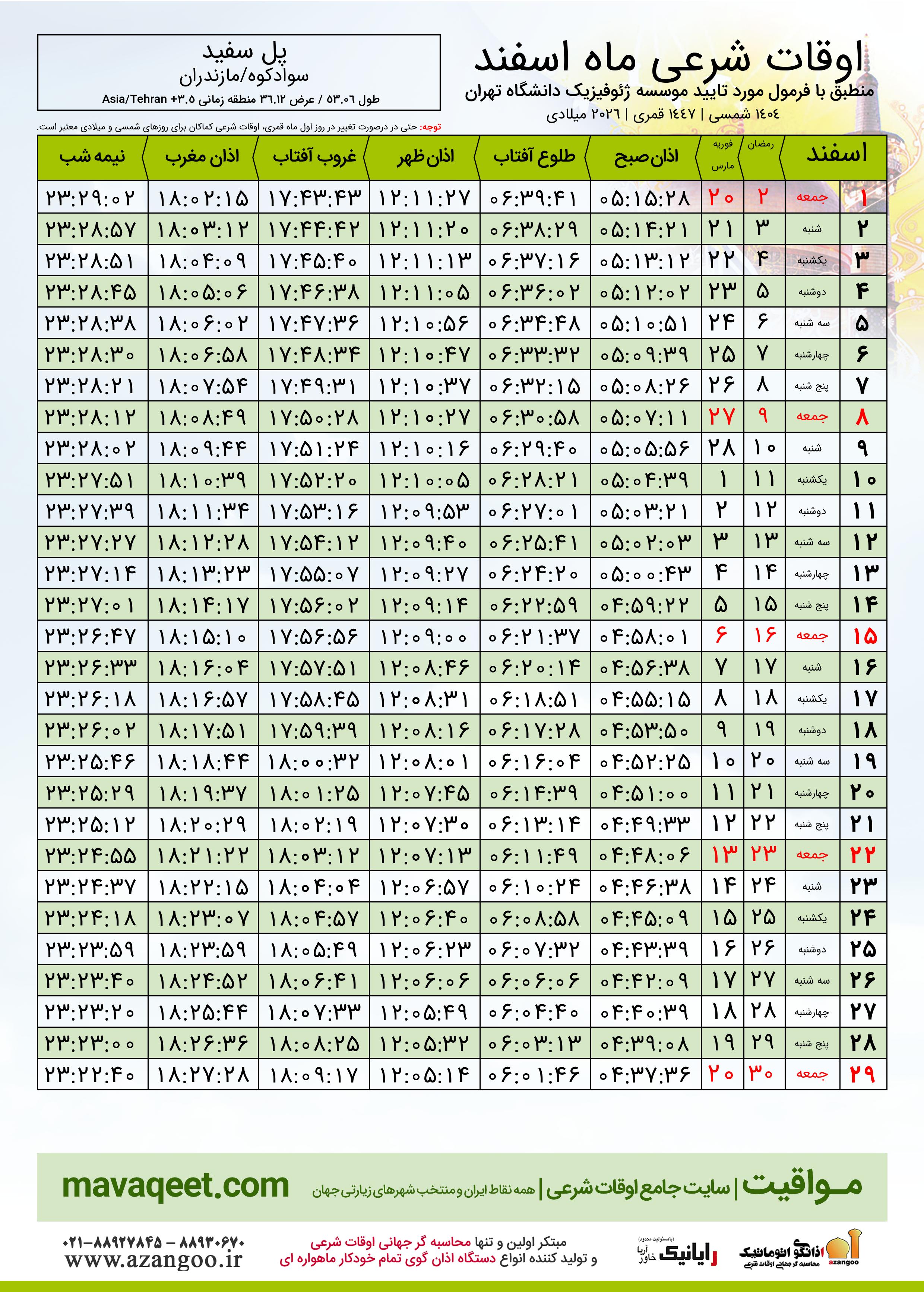 اوقات شرعی ماه رمضان شهر پل سفید ١٤٠٤ - ٠٤ شمسی | ٢٠٢٦ میلادی