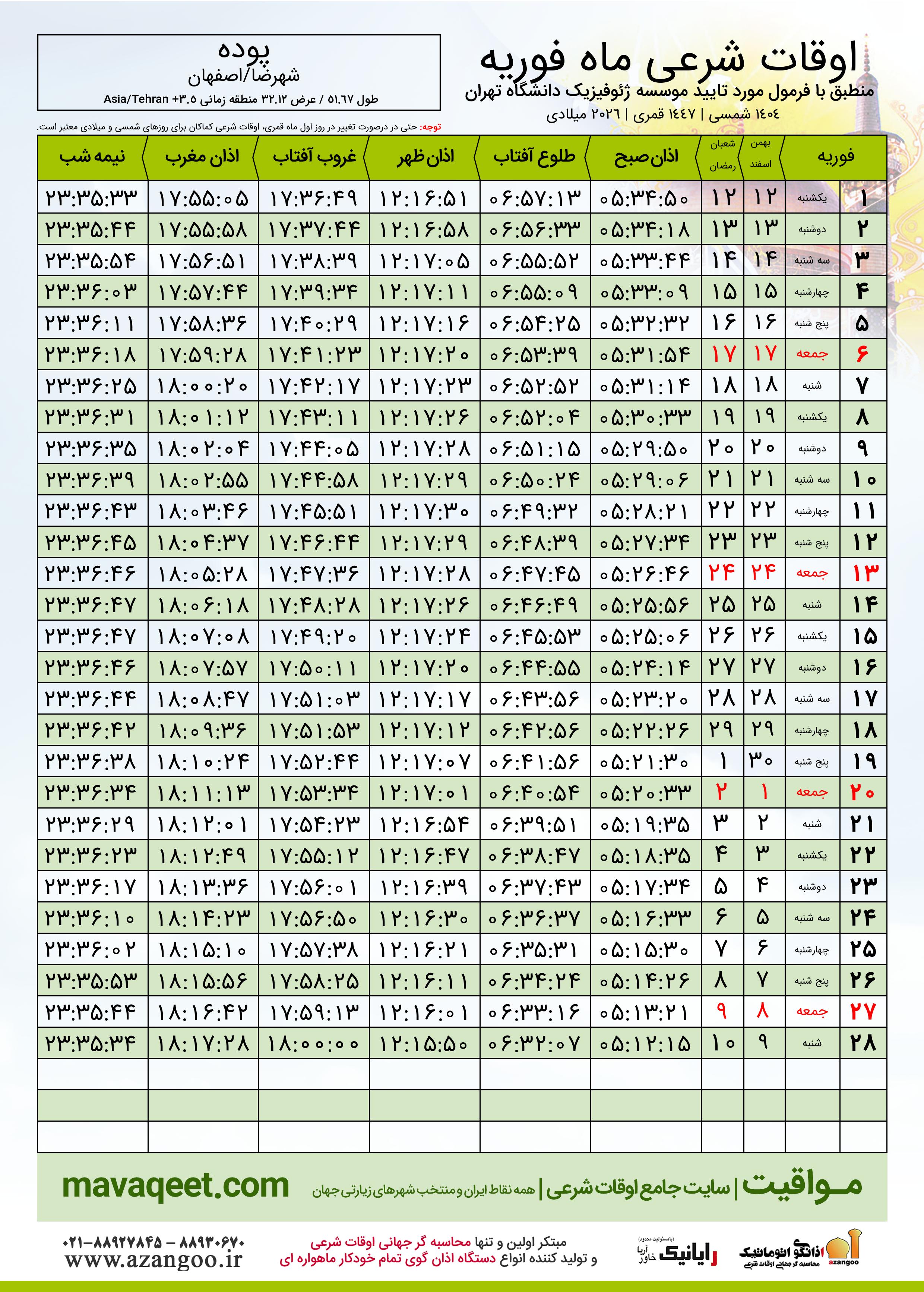 اوقات شرعی ماه شعبان ١٤٤٧ هـ.ق شهر پوده بر