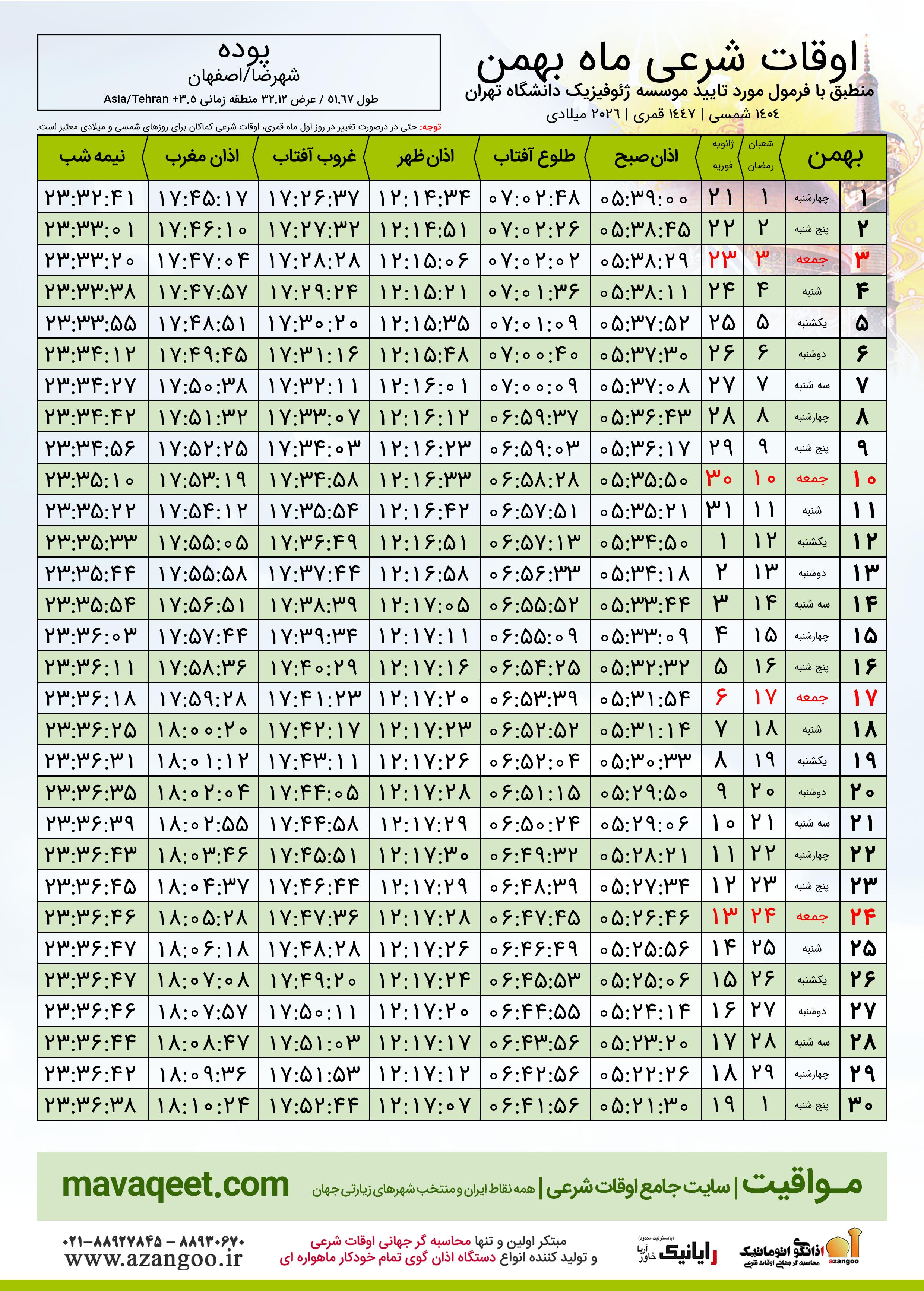 دانلود اوقات شرعی بهمن ٠٤ - ١٤٠٤ شهر پوده