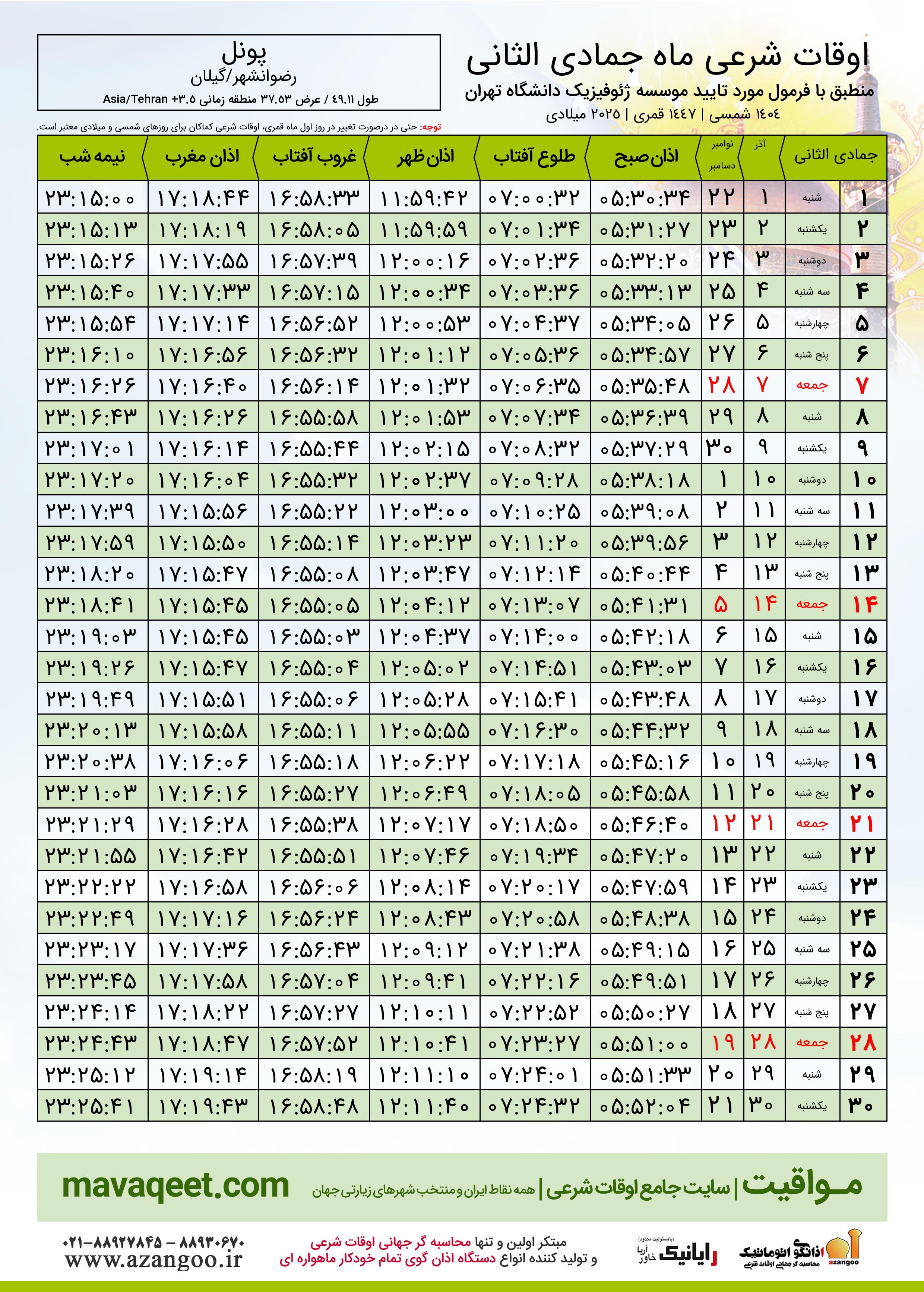 اوقات شرعی ماه جمادی الثانی ١٤٤٧ هـ.ق شهر پونل بر
