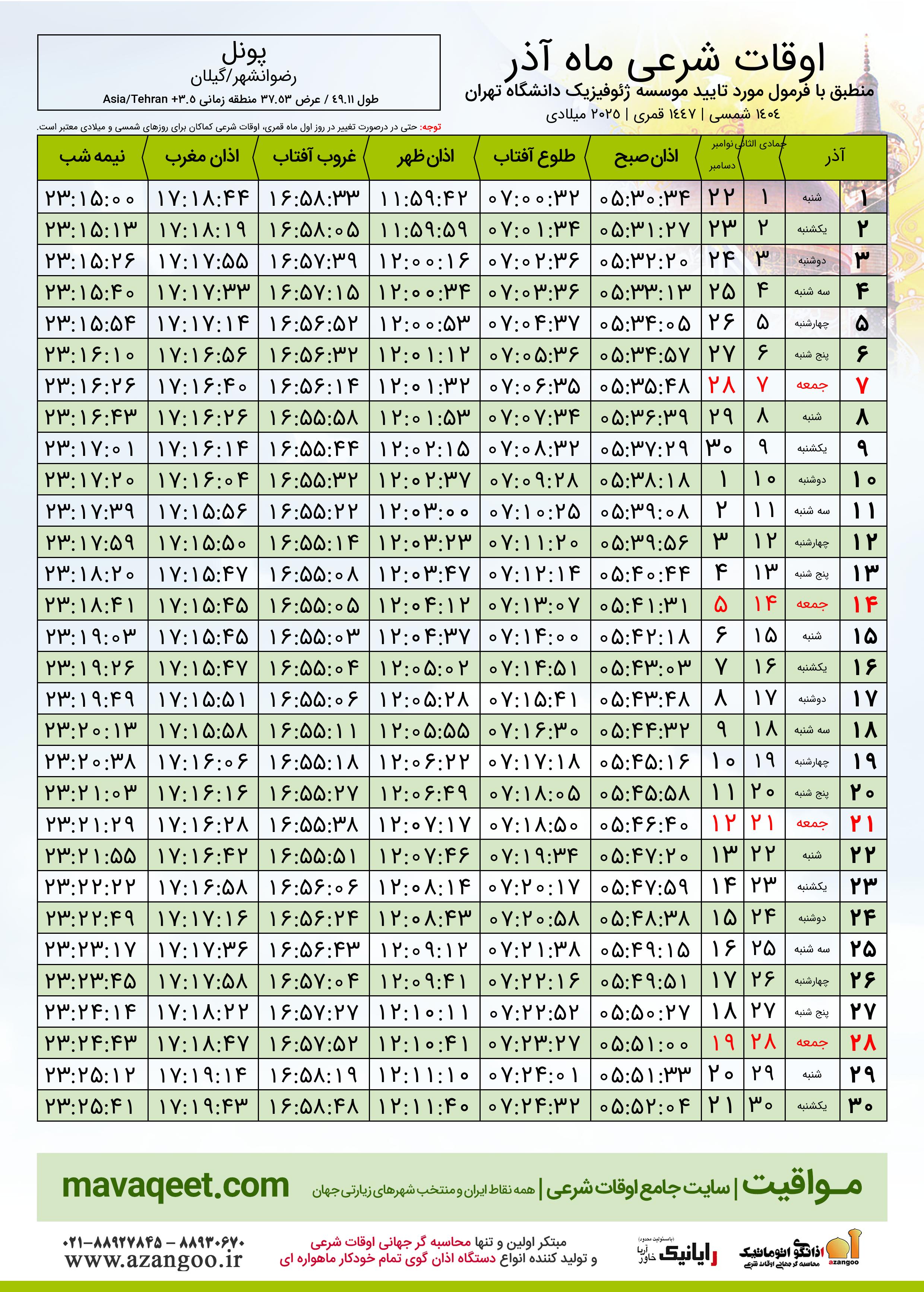 اوقات شرعی آذر ١٤٠٤ شمسی شهر پونل