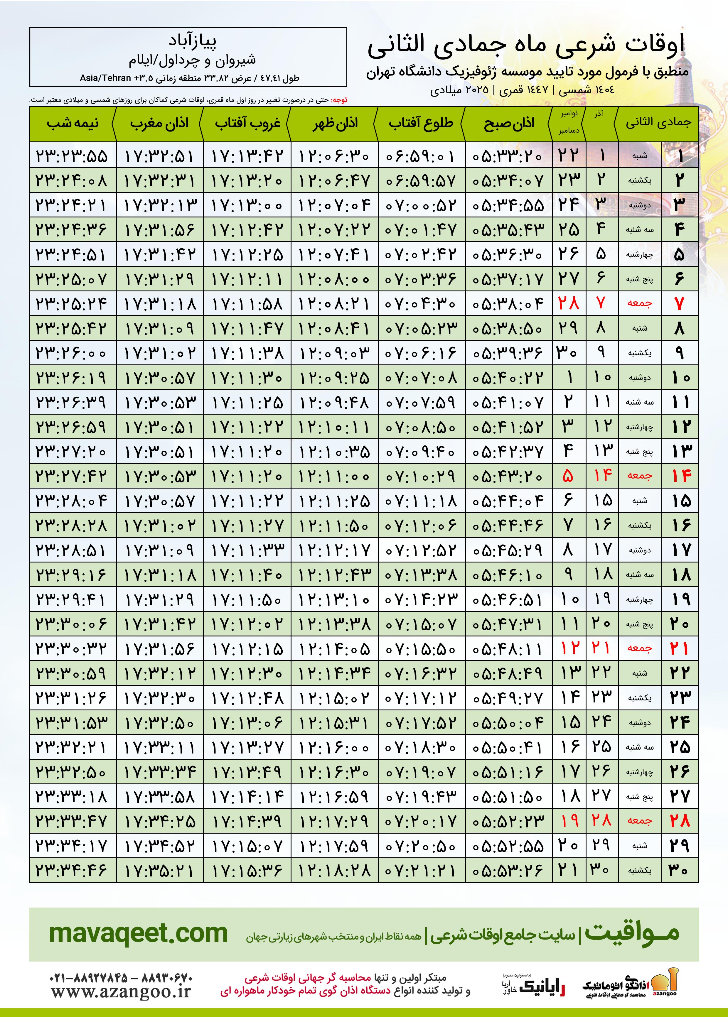 اوقات شرعی ماه جمادی الثانی ١٤٤٧ هـ.ق شهر پیازآباد بر