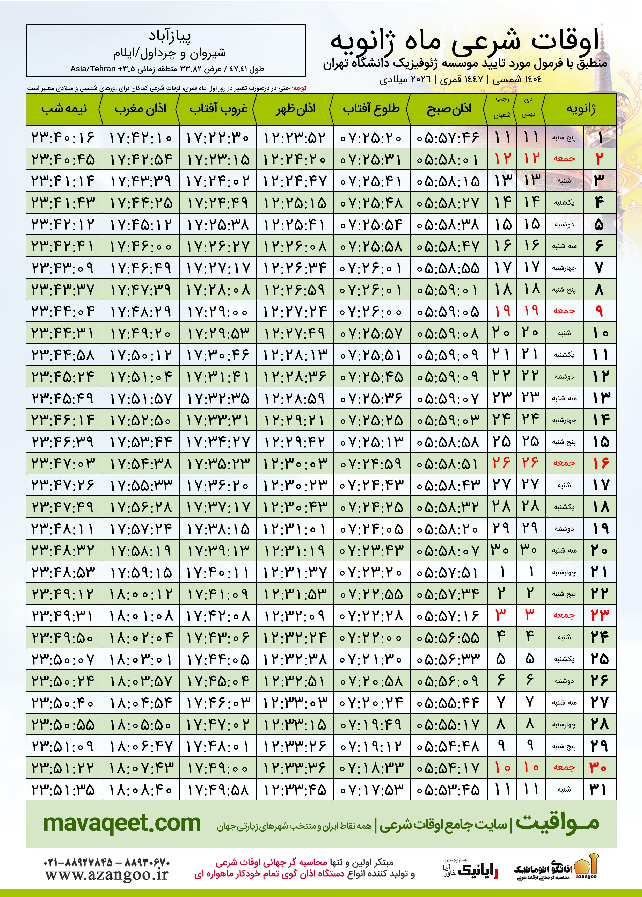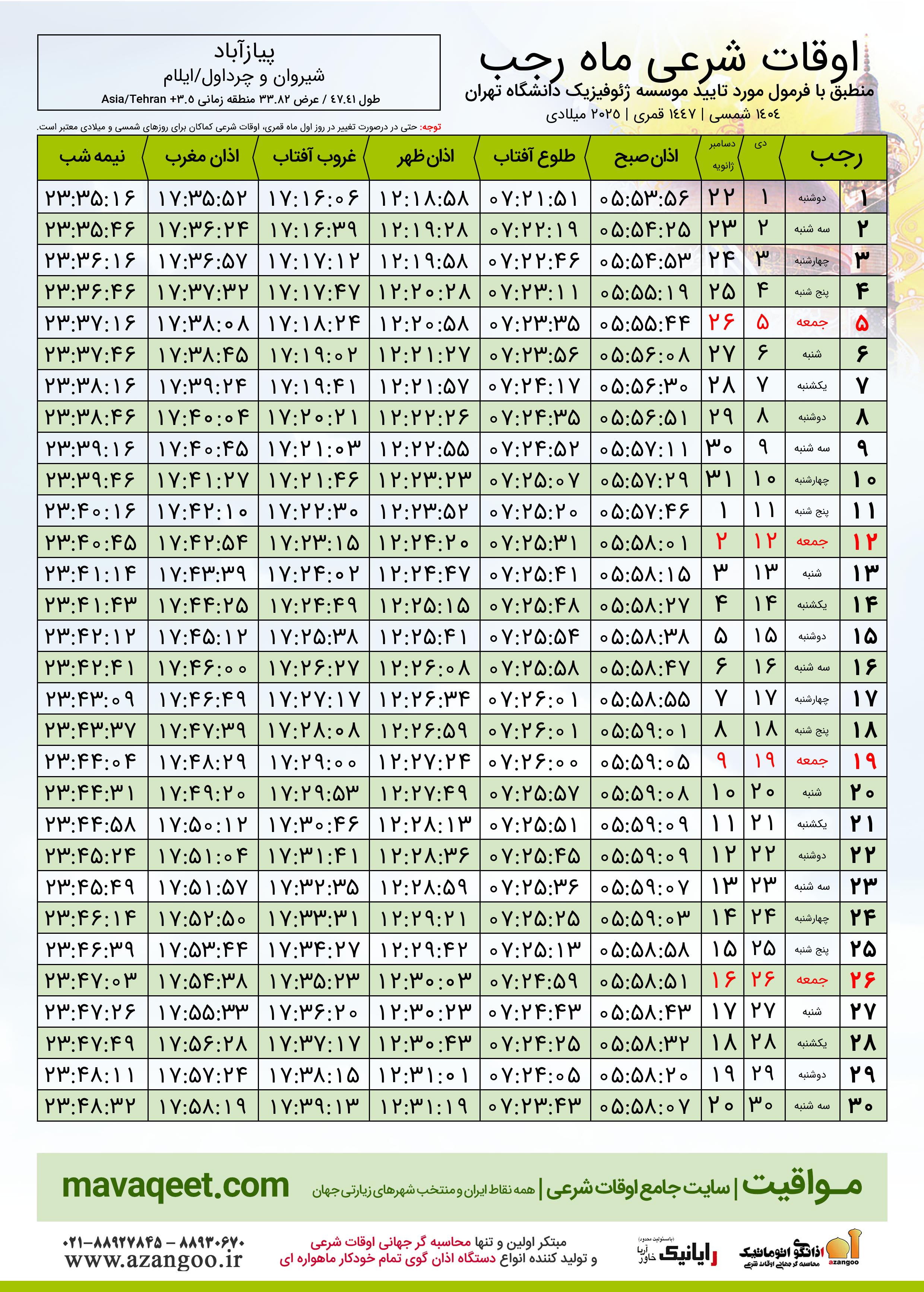 اوقات شرعی ماه رجب ١٤٤٧ هـ.ق شهر پیازآباد بر