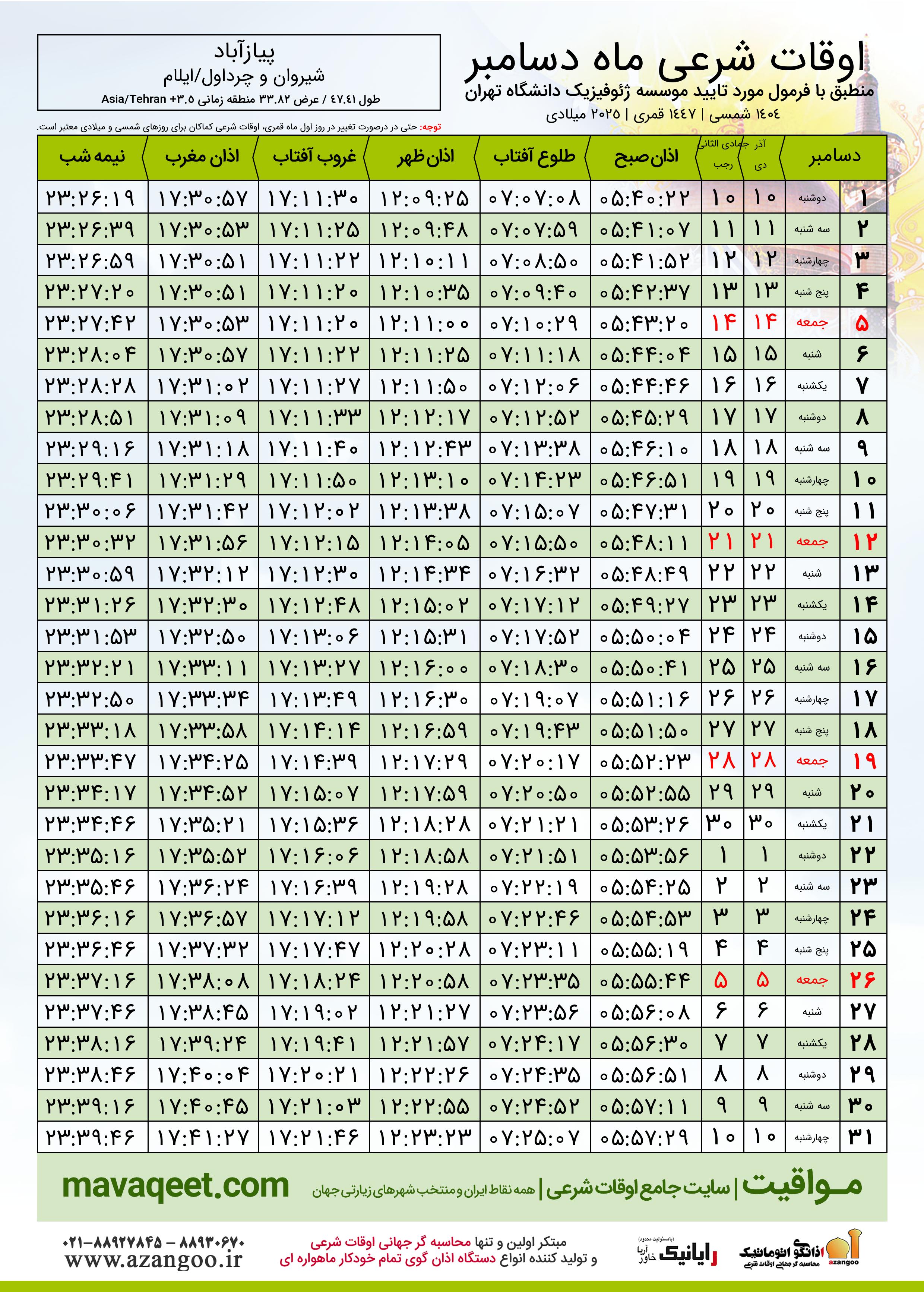 دانلود اوقات شرعی دسامبر ٢٠٢٥ شهر پیازآباد