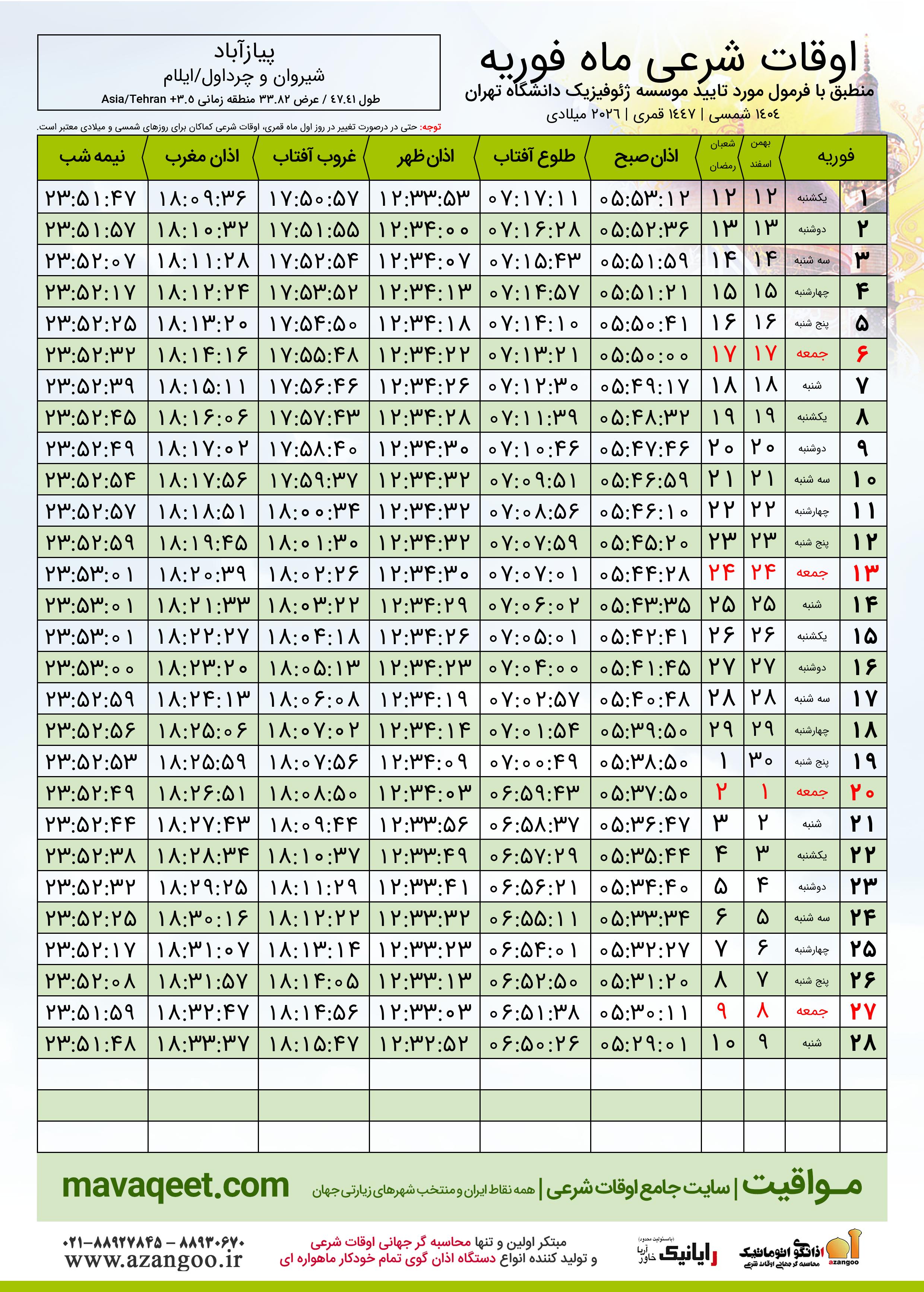 دانلود اوقات شرعی فوریه ٢٠٢٦ شهر پیازآباد