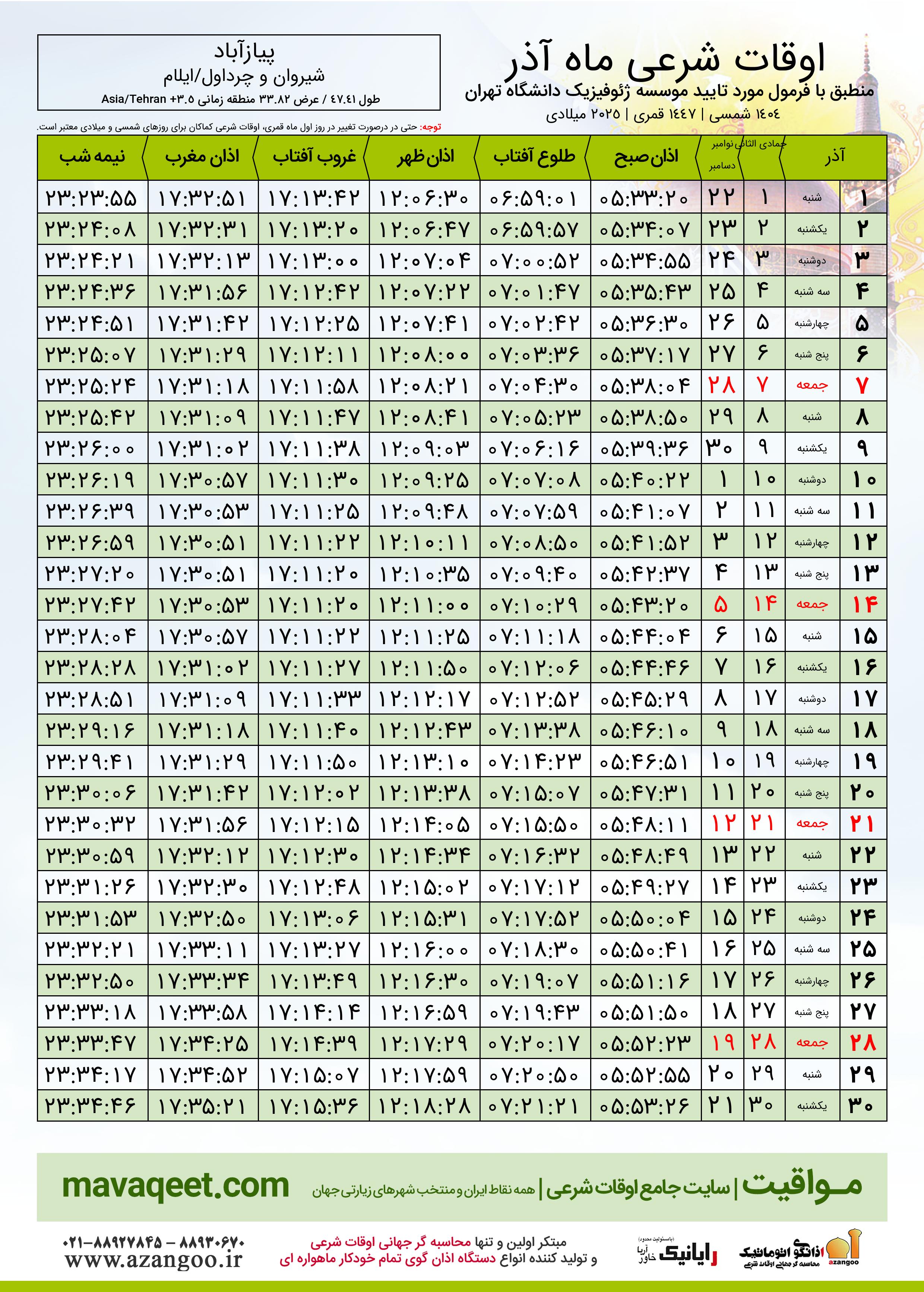 اوقات شرعی آذر ١٤٠٤ شمسی شهر پیازآباد