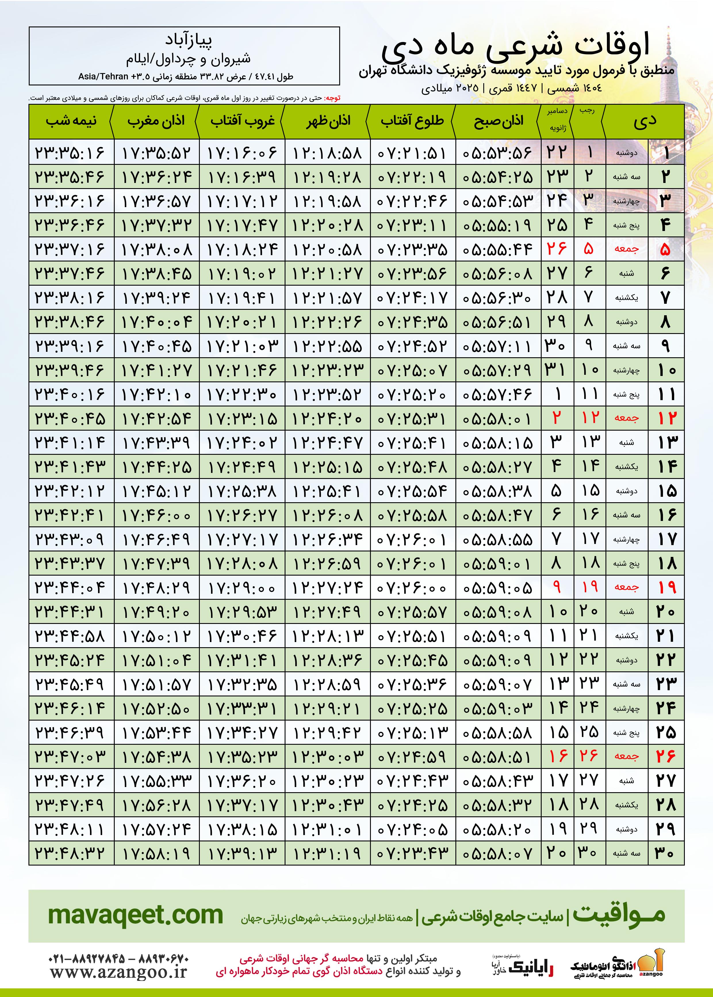 اوقات شرعی دی ١٤٠٤ شمسی شهر پیازآباد