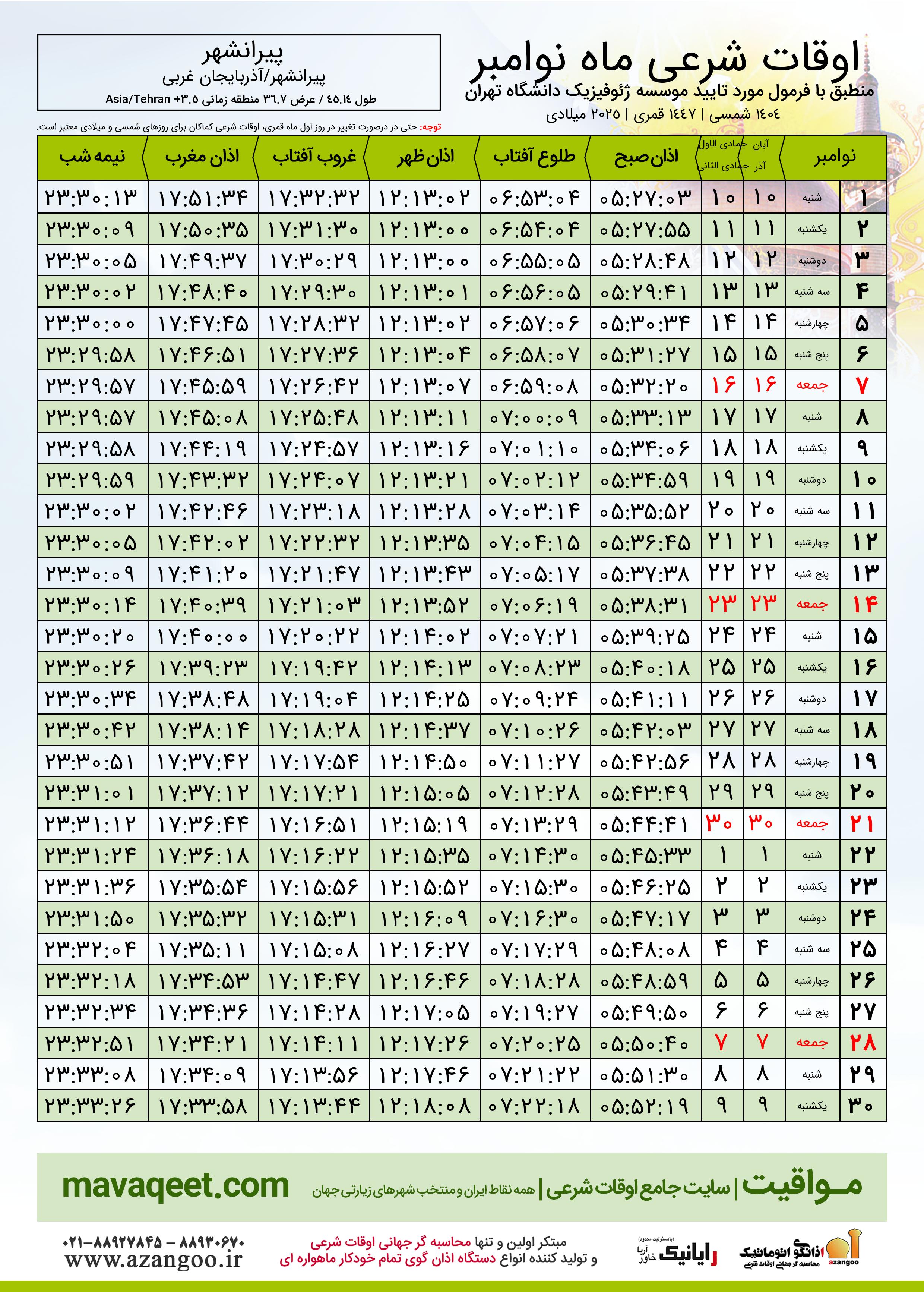 جدول اوقات شرعی نوامبر ٢٠٢٥ میلادی شهر پیرانشهر