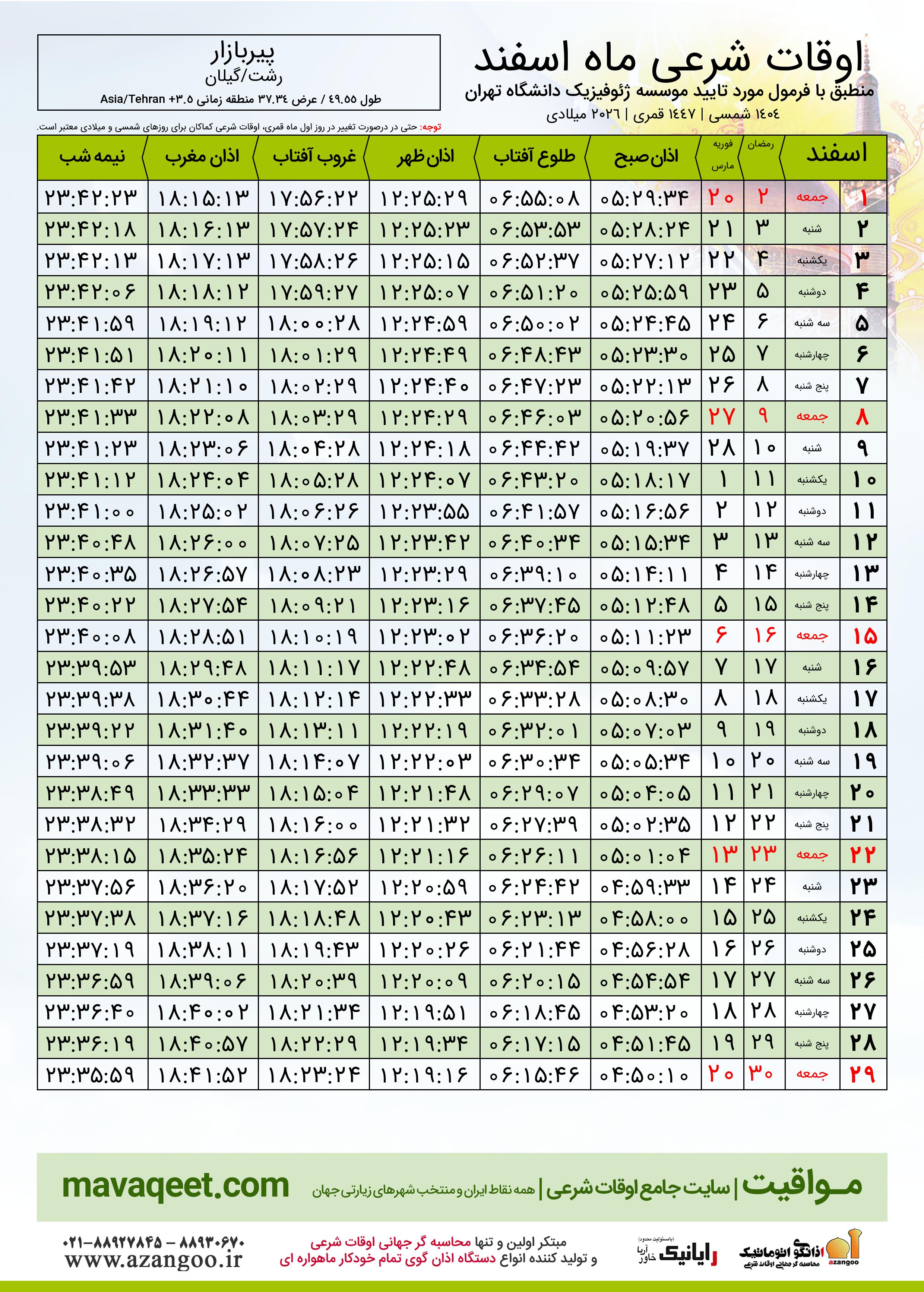 اوقات شرعی اسفند ١٤٠٤ شمسی شهر پیربازار