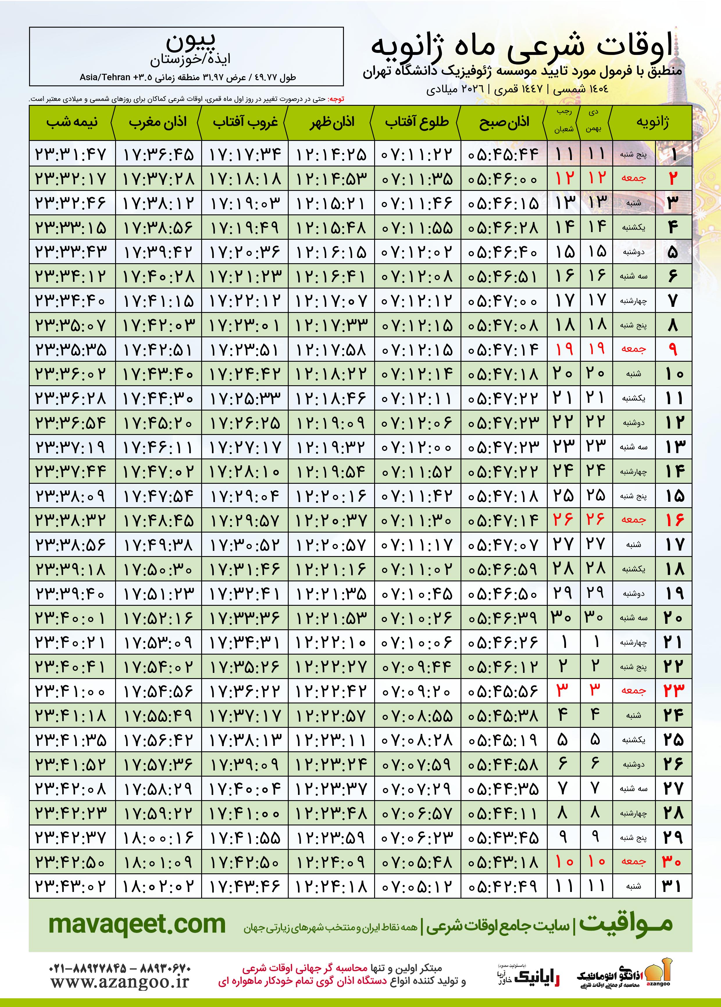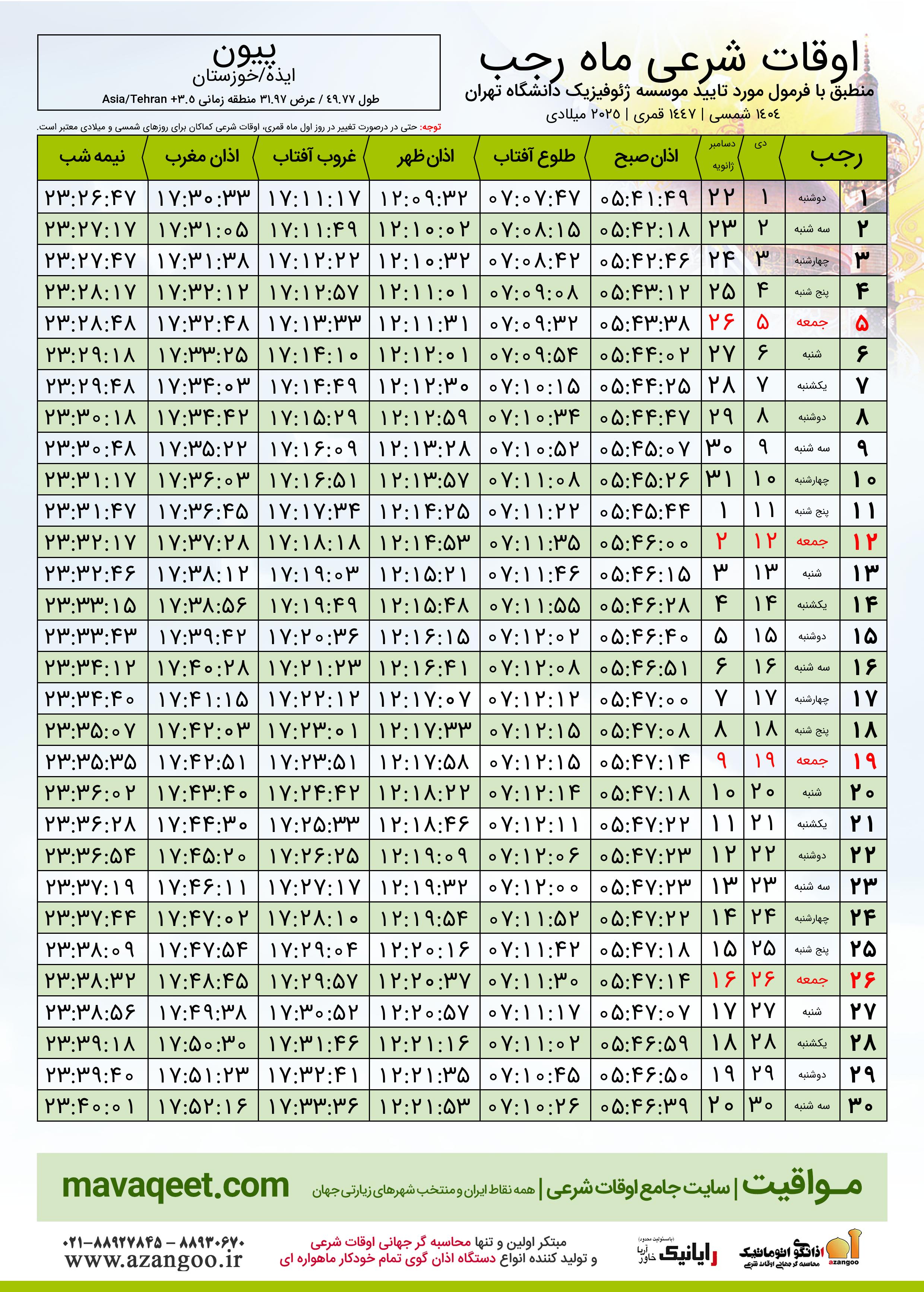 اوقات شرعی ماه رجب ١٤٤٧ هـ.ق شهر پیون بر