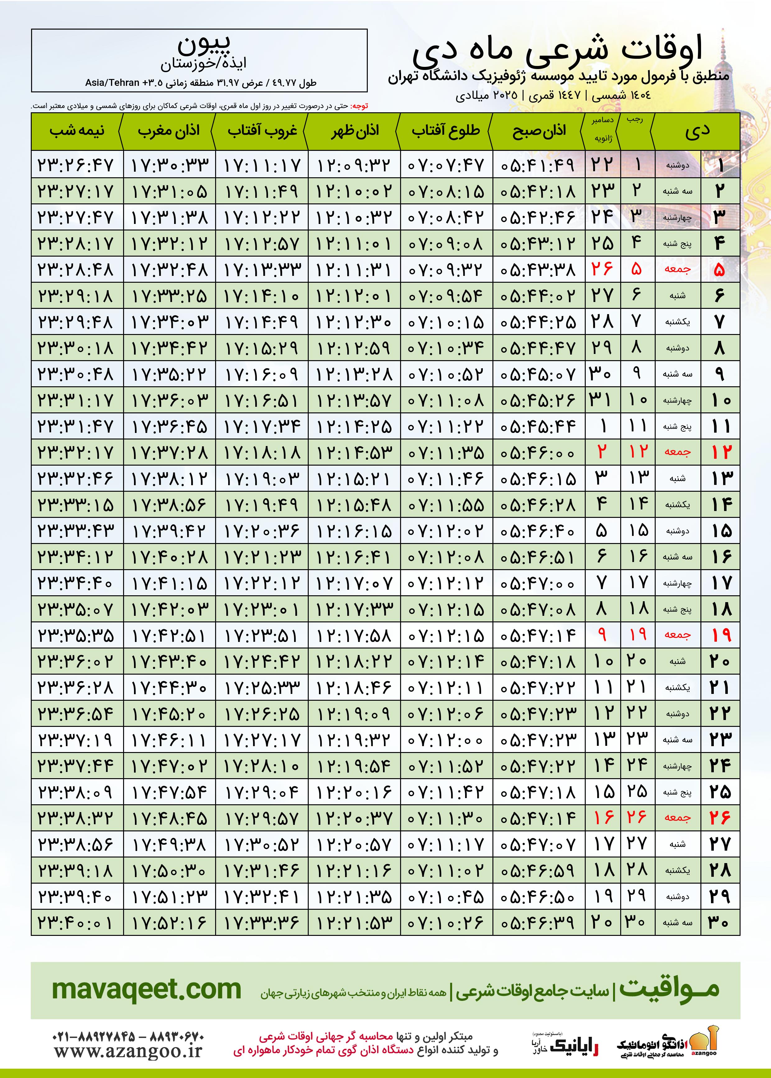 اوقات شرعی دی ١٤٠٤ شمسی شهر پیون