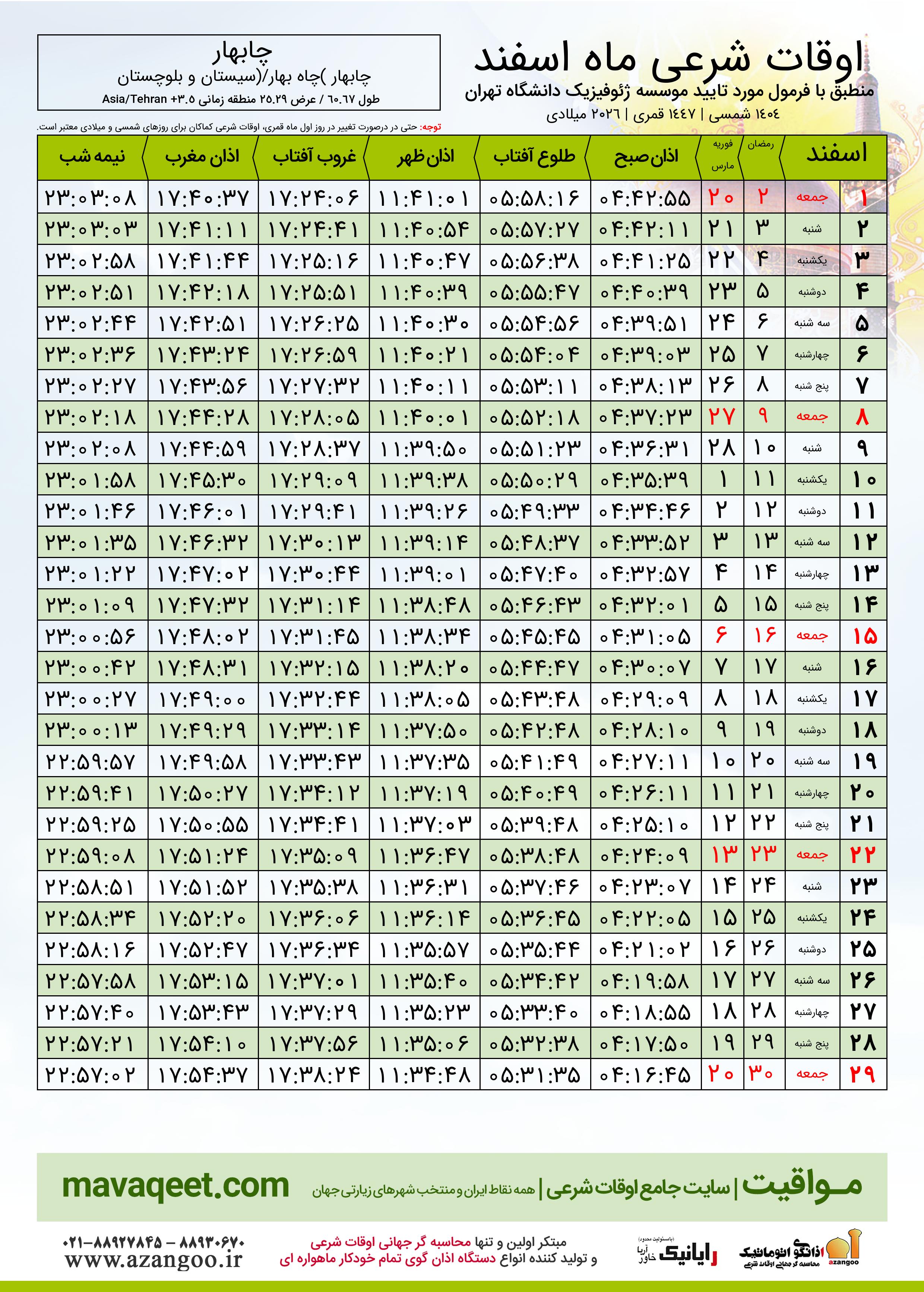 اوقات شرعی اسفند ١٤٠٤ شمسی شهر چابهار
