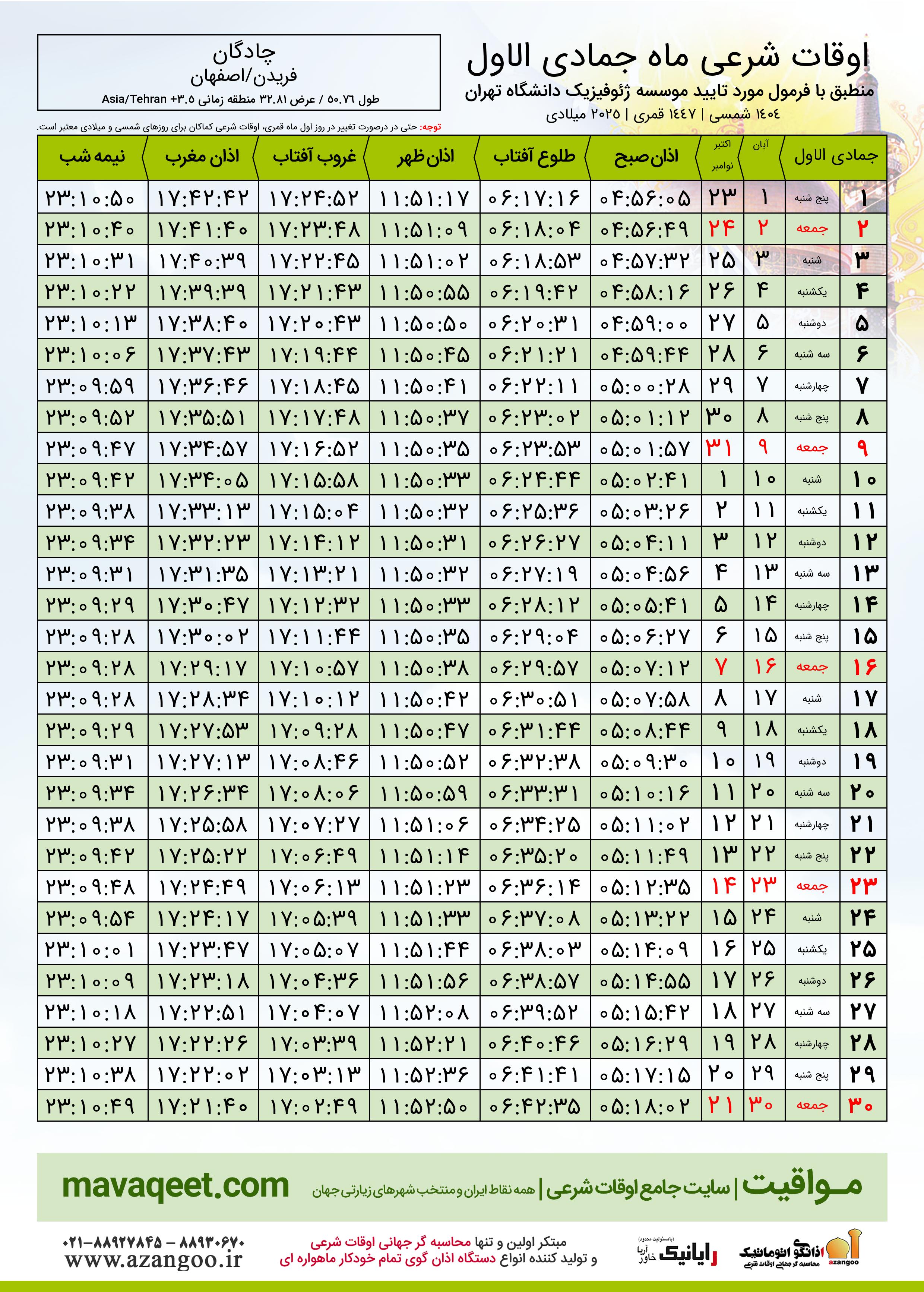 جدول اوقات شرعی جمادی الاول ١٤٤٧ قمری شهر چادگان