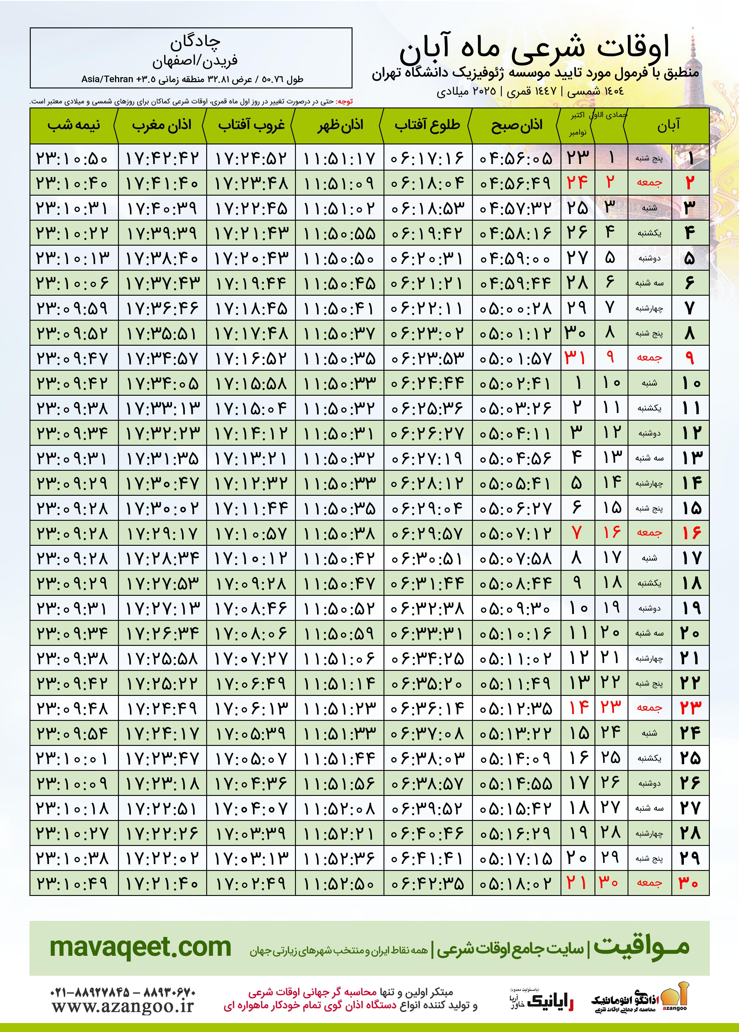 جدول اوقات شرعی آبان ١٤٠٤ شمسی شهر چادگان