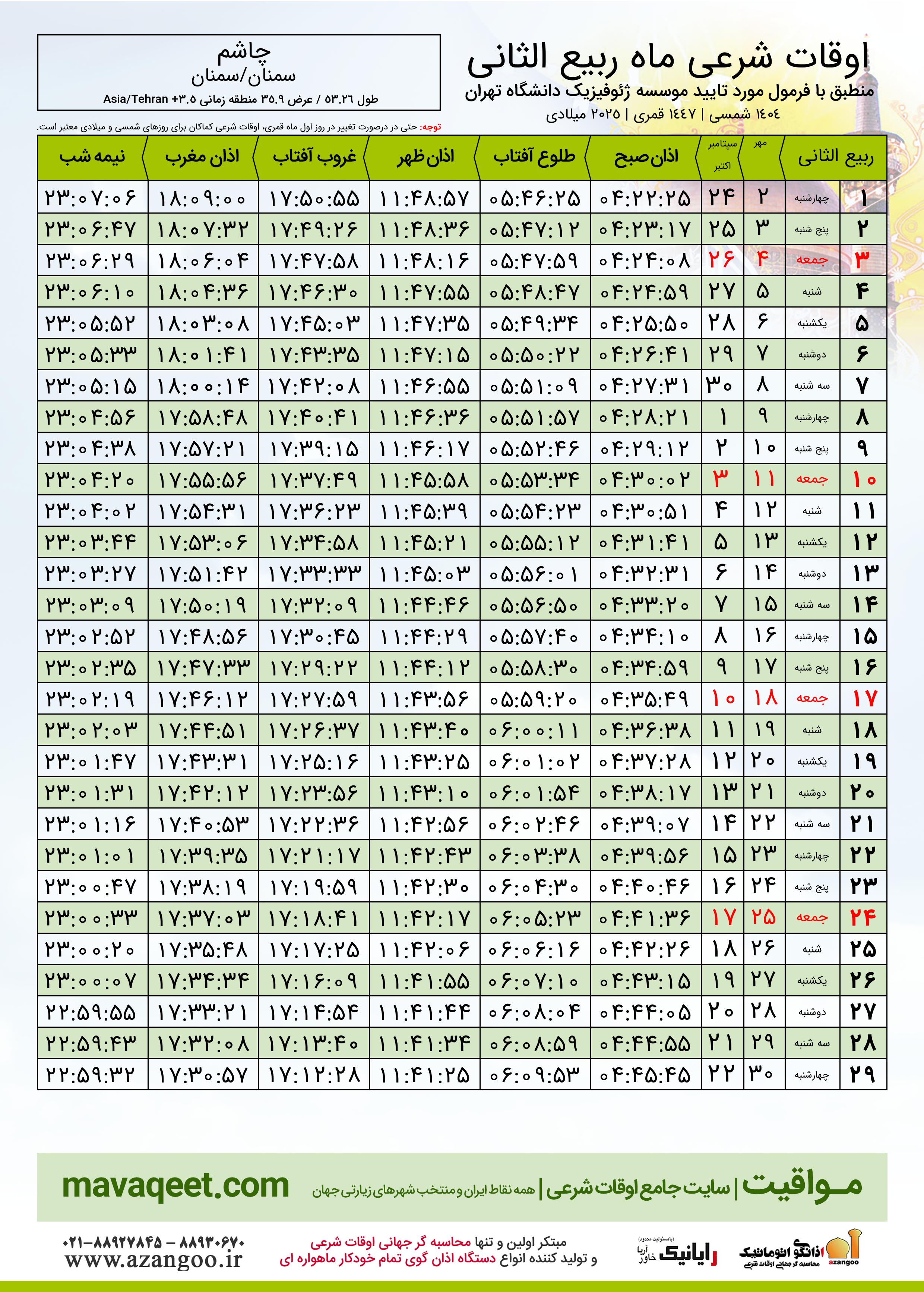 اوقات شرعی ماه ربیع الثانی ١٤٤٧ هـ.ق شهر چاشم بر