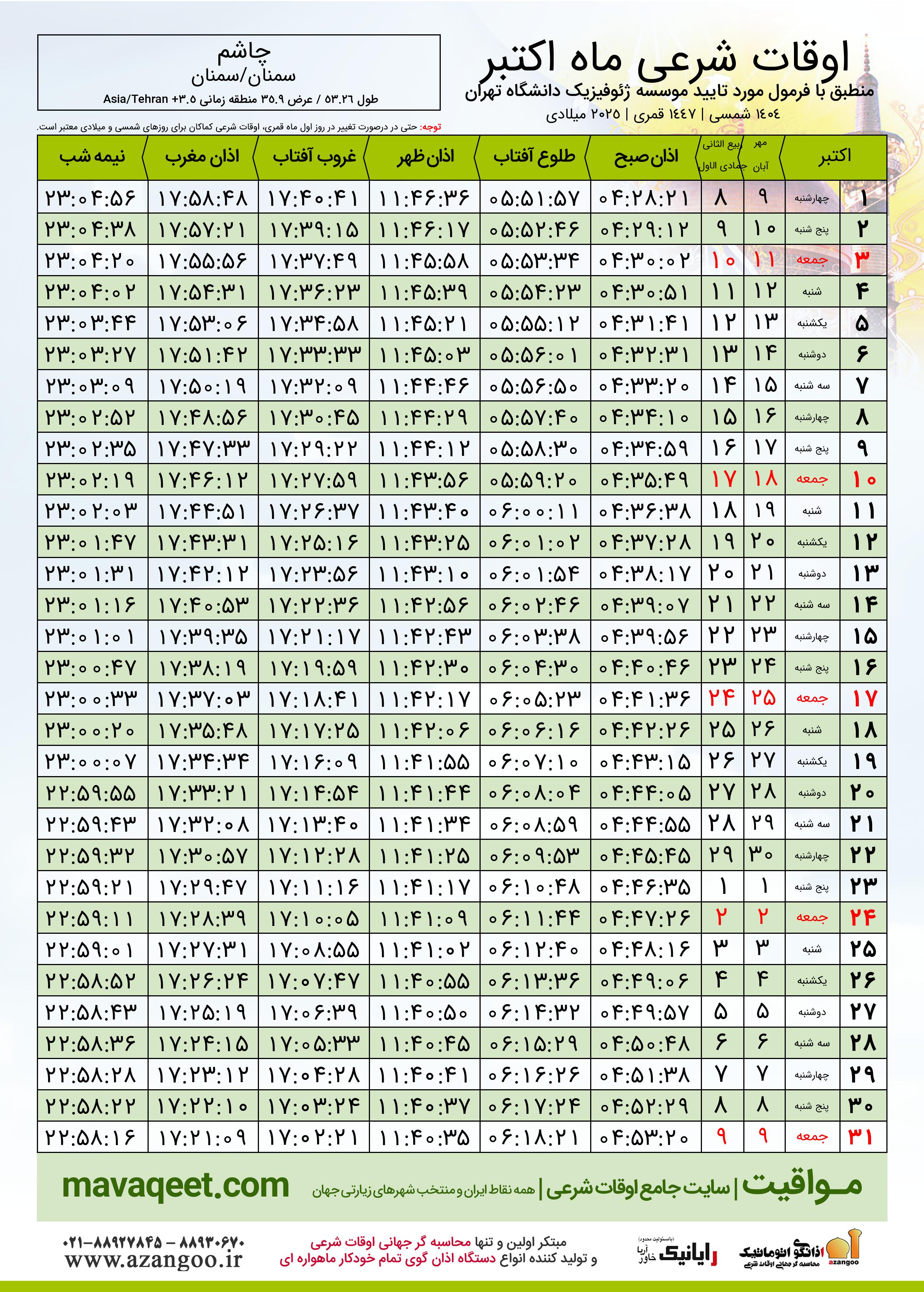 جدول اوقات شرعی اکتبر ٢٠٢٥ میلادی شهر چاشم