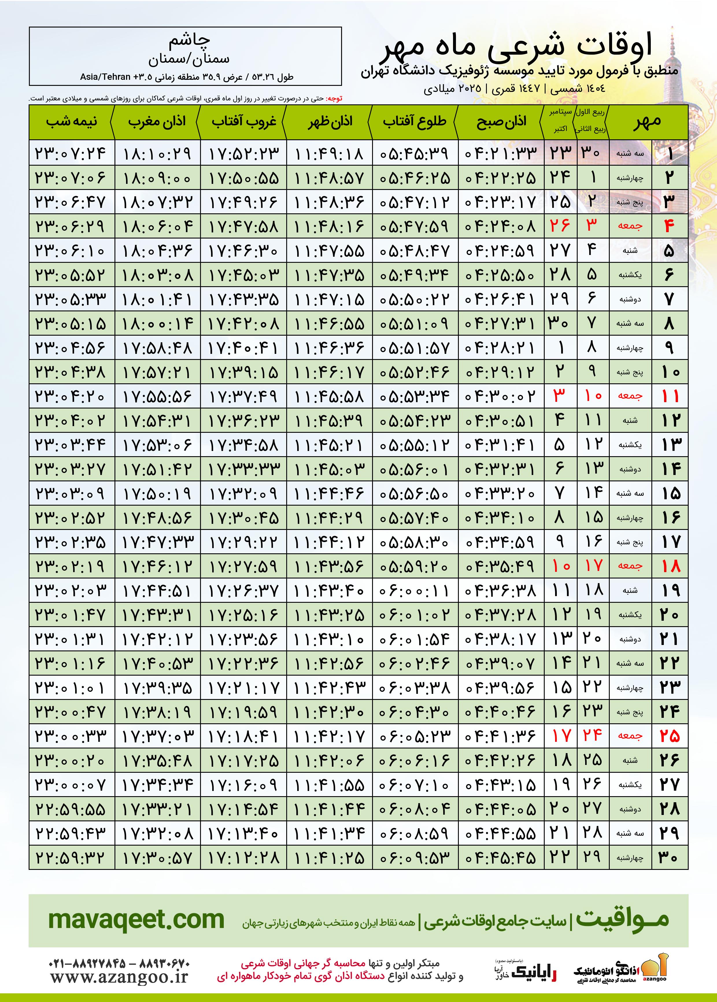 جدول اوقات شرعی مهر ١٤٠٤ شمسی شهر چاشم