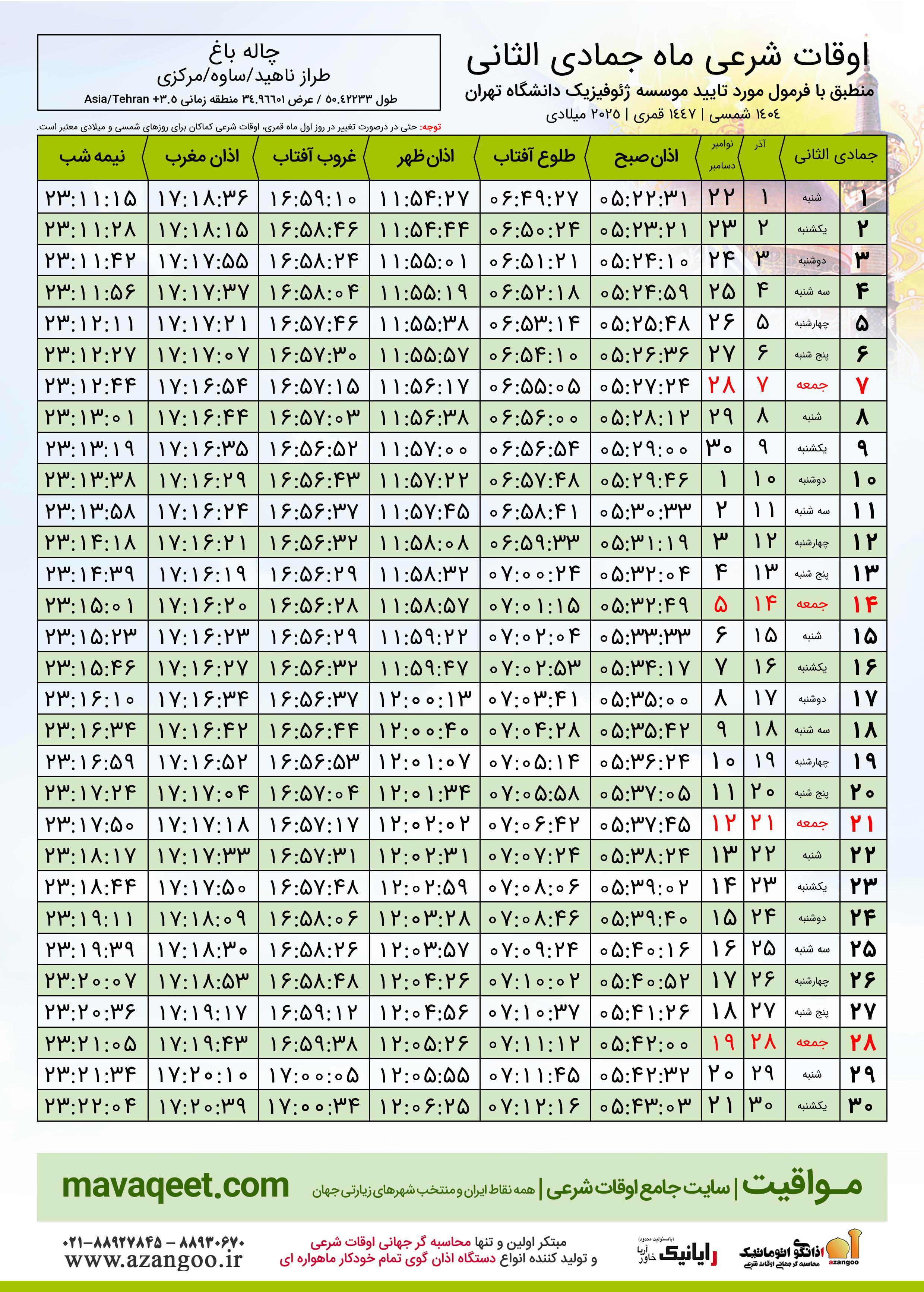 جدول اوقات شرعی جمادی الثانی ١٤٤٧ قمری روستای چاله باغ