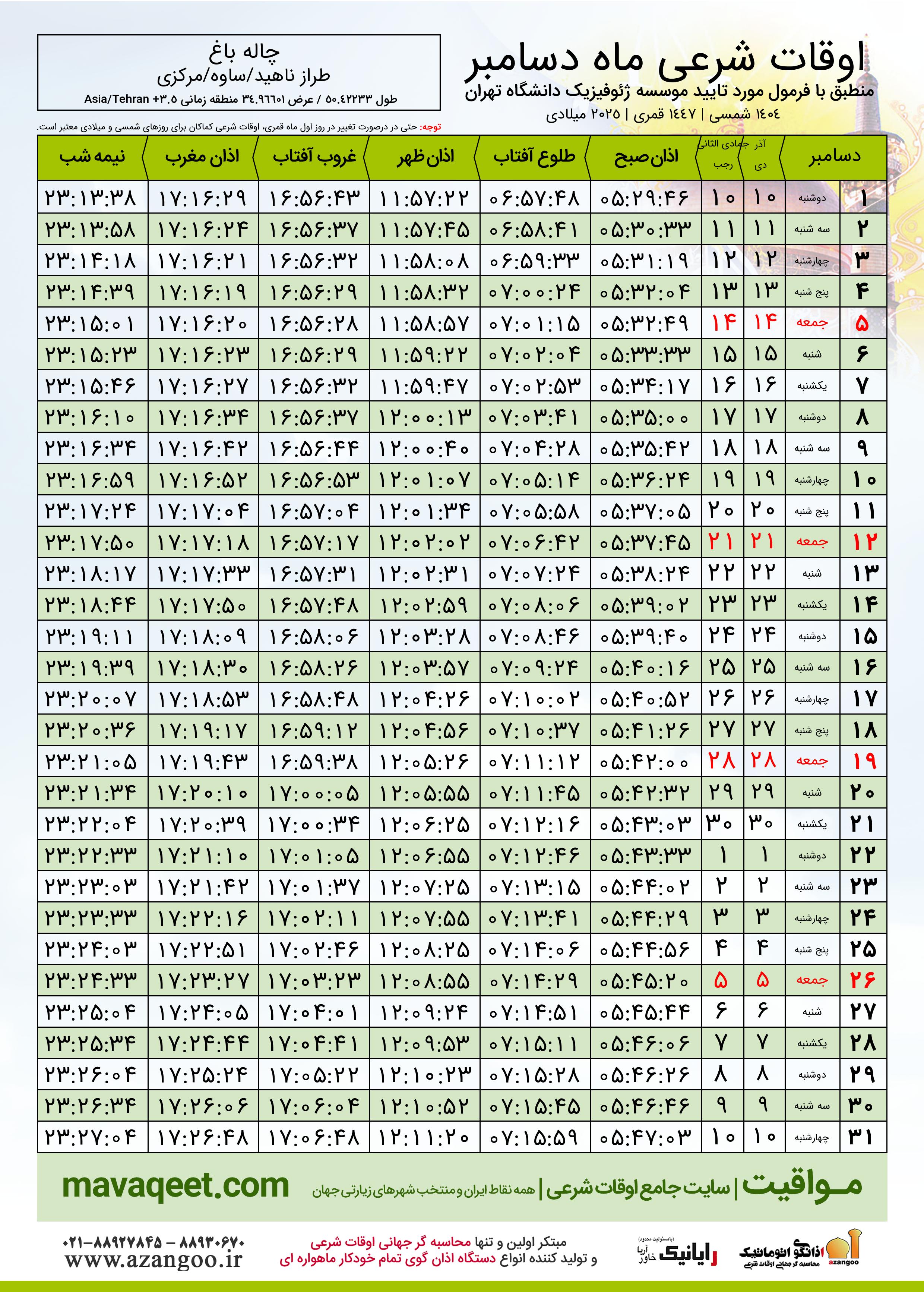 | ١٤ آذر ١٤٠٤ | ٠٥:٣٢:٤٩ | ٠٧:٠١:١٥ | ١١:٥٨:٥٧ | ١٦:٥٦:٢٨ | ١٧:١٦:٢٠ | ٢٣:١٥:٠١ |
